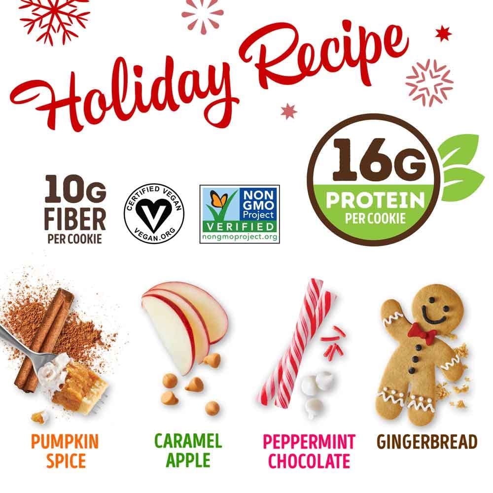 BULLET POINTS : 1 > Holiday Variety Pack: Satisfyingly firm and chewy, these plant based cookies are sprinkled with semi sweet morsels of chocolate; Contains 4 Pumpkin Spice, 3 Caramel Apple, 3 Peppermint Chocolate and 3 Gingerbread cookies