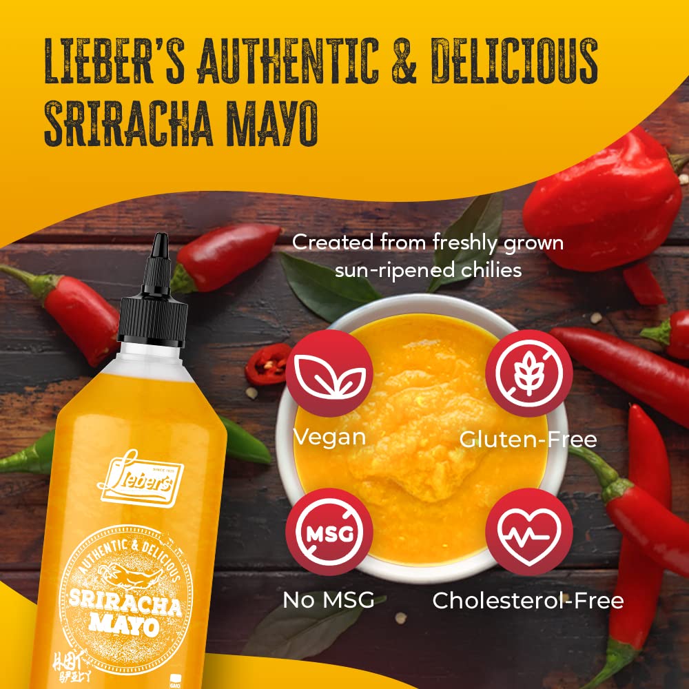 About this item Enjoy the authentic and delicious taste of Lieber's Sriracha Mayo. It is perfect for sandwiches, dips, sushi, spreads, and more! Its squeeze-tip bottle makes it even more convenient to use! Lieber's Sriracha Mayo is made with the highest quality, Gluten-free ingredients like red chili peppers, eggs, fresh garlic, and 100% sunflower oil. Along with its creamy and delicious taste, Lieber's Sriracha Mayo condiment is proudly Non-GMO, No MSG, Gluten-free, Cholesterol-free, and vegan. Our easy-to-use squeeze bottle has a twist lock cap and a precision tip that gives you total control when applying to your favorite foods. This cholesterol-free* (*1g total fat per serving) siracha-flavored mayo has no artificial flavors and no trans fat, and less than 1 gram of sugar, making it your new go-to condiment you can feel good about › See more product details,Enjoy the authentic and delicious taste of Lieber's Sriracha Mayo. It is perfect for sandwiches, dips, sushi, spreads, and more! Its squeeze-tip bottle makes it even more convenient to use!,Lieber's Sriracha Mayo is made with the highest quality, Gluten-free ingredients like red chili peppers, eggs, fresh garlic, and 100% sunflower oil,Along with its creamy and delicious taste, Lieber's Sriracha Mayo condiment is proudly Non-GMO, No MSG, Gluten-free, Cholesterol-free, and vegan,Our easy-to-use squeeze bottle has a twist lock cap and a precision tip that gives you total control when applying to your favorite foods,This cholesterol-free* (*1g total fat per serving) siracha-flavored mayo has no artificial flavors and no trans fat, and less than 1 gram of sugar, making it your new go-to condiment you can feel good about