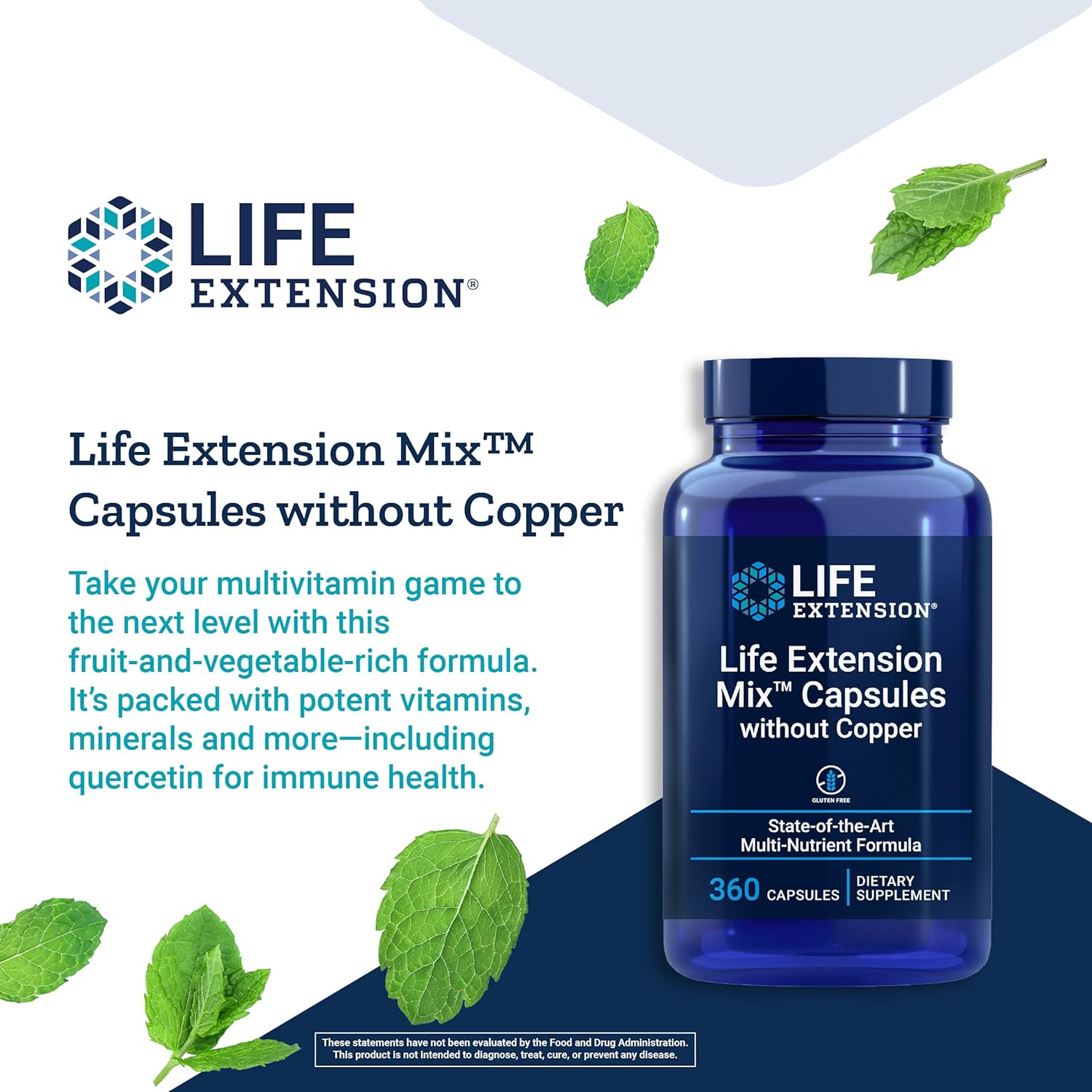 ALL YOUR DAILY NUTRIENTS - This advanced, high-potency vitamin, mineral, fruit and vegetable supplement provides all the daily nutrients your body needs to maintain optimal health. We’ve combined nature’s most important nutrients into one product, eliminating the need to take dozens of separate supplements10GET YOUR FRUITS & VEGGIES - Studies show that people who eat plenty of fruits and vegetables enjoy long, healthy lives. But what if getting the recommended five daily servings isn't on the menu? Every daily dose of Life Extension Mix Capsules without Copper gives you an extensive array of nutrients, including standardized fruit and vegetable extracts10STATE-OF-THE-ART NUTRITION - Life Extension Mix Capsules without Copper goes above and beyond your daily vitamin and mineral needs. Pomegranate and green tea extracts, quercetin and an advanced chromium complex help maintain cardiovascular health, immune health and more. Additional nutrients support eye, DNA and metabolic health, and fight oxidative stress to support a long, healthy life10INGREDIENTS MATTER - Sourced using only the finest raw ingredients with the purity and potency your body deserves. This product is certified non-GMO and gluten-free. Manufactured in the USA and a Certificate of Analysis is available for every product we produce10LIVE YOUR HEALTHIEST LIFE - For over 40 years, we’ve been developing advanced, effective formulas made with the highest standards and based on the latest scientific findings. We believe the answers to a healthier, richer life are within reach and that rigorous scientific research is the path to get us there. Our formulations are created using the exact ingredients and dosages used in the studies that inspired them, ensuring that maximum bioavailability and efficacy are achieved1010