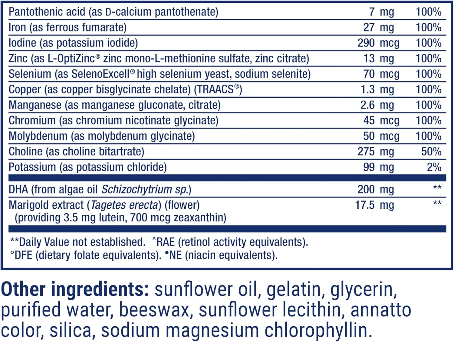 GIVE YOUR CHILD A NUTRITIONAL ADVANTAGE - Women who are pregnant, trying to become pregnant, or who are nursing have unique nutritional needs. This science-based supplement provides the latest recommended dosages of vitamins and minerals, plus nutrients like DHA omega-3, choline, lutein and zeaxanthin for both mom and baby