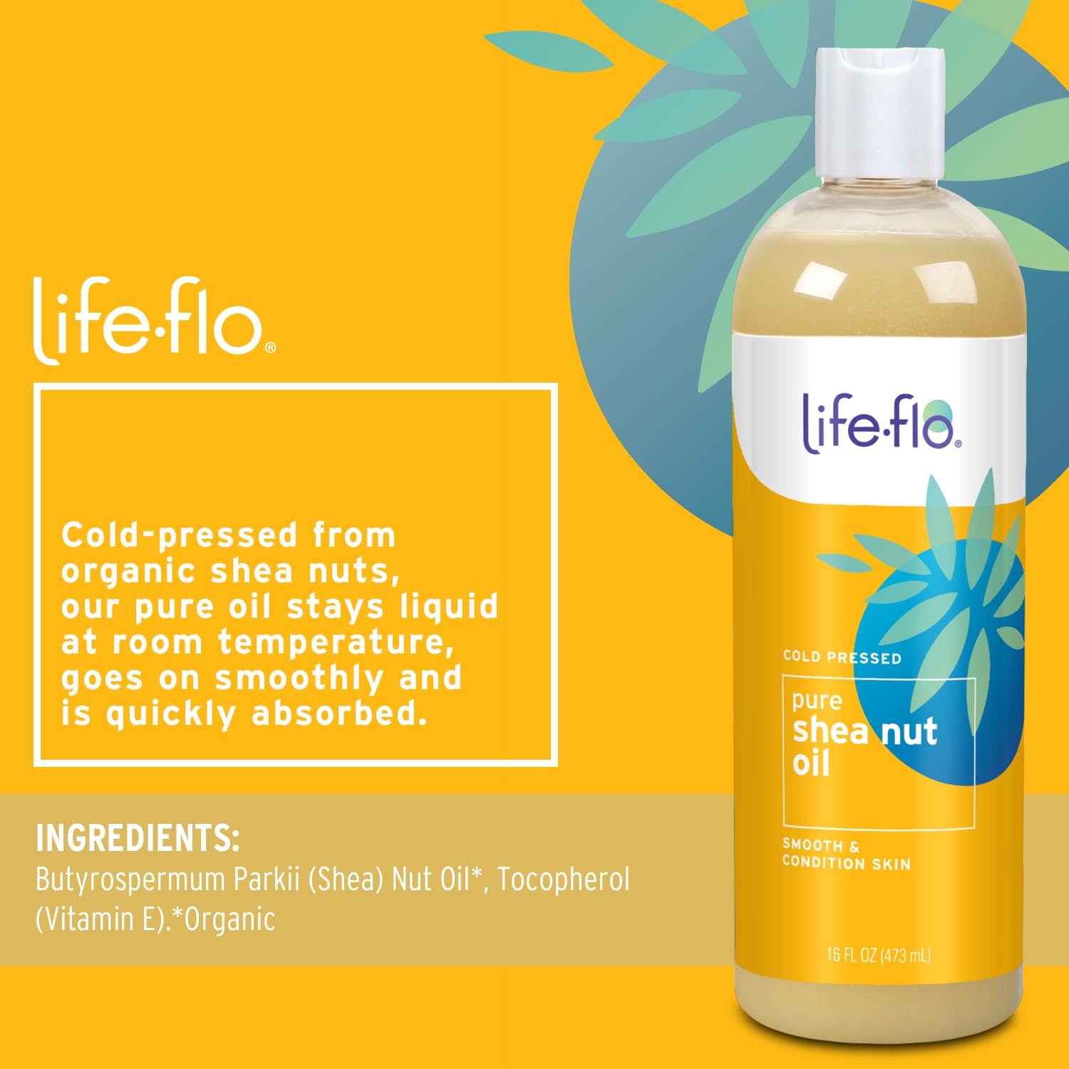 About this item Soft, Vibrant Hair β The perfect conditioning hair oil, Life-flo Pure Shea Nut Oil smooths and moisturizes dry hair, tames frizz and adds softness and shine while calming a dry scalp. Fresh, Soft Skin β Naturally rich in fatty acids, shea oil is very nourishing to dry skin. Gentle enough for the complexion, it makes an excellent face oil and all-over moisturizer. Try it in place of a body lotion or apply it to elbows, heels and other dryness prone areas. Aromatherapy & More β Used as a carrier oil, shea nut oil mixes readily with other essential oils and makes an excellent base oil for DIY beauty products and aromatherapy. Plus its non-greasy, luxurious feel makes it a popular massage oil. Purely the Best β Created during the production of shea butter, shea nut oil is the pure oil, cold pressed and fractionated to stay liquid at room temperature. Weβve added a small amount of vitamin E to help preserve product freshness. The Life-flo Difference β Manufactured in our GMP-certified facility in Utah and never tested on animals. Like all Life-flo products, our shea nut oil is lab tested to ensure the purity of its ingredients, and comes with a 60-day money back guarantee. βΊ See more product details,Soft, Vibrant Hair β The perfect conditioning hair oil, Life-flo Pure Shea Nut Oil smooths and moisturizes dry hair, tames frizz and adds softness and shine while calming a dry scalp,Fresh, Soft Skin β Naturally rich in fatty acids, shea oil is very nourishing to dry skin. Gentle enough for the complexion, it makes an excellent face oil and all-over moisturizer. Try it in place of a body lotion or apply it to elbows, heels and other dryness prone areas,Aromatherapy & More β Used as a carrier oil, shea nut oil mixes readily with other essential oils and makes an excellent base oil for DIY beauty products and aromatherapy. Plus its non-greasy, luxurious feel makes it a popular massage oil,Purely the Best β Created during the production of shea butter, shea nut oil is the pure oil, cold pressed and fractionated to stay liquid at room temperature. Weβve added a small amount of vitamin E to help preserve product freshness,The Life-flo Difference β Manufactured in our GMP-certified facility in Utah and never tested on animals. Like all Life-flo products, our shea nut oil is lab tested to ensure the purity of its ingredients, and comes with a 60-day money back guarantee