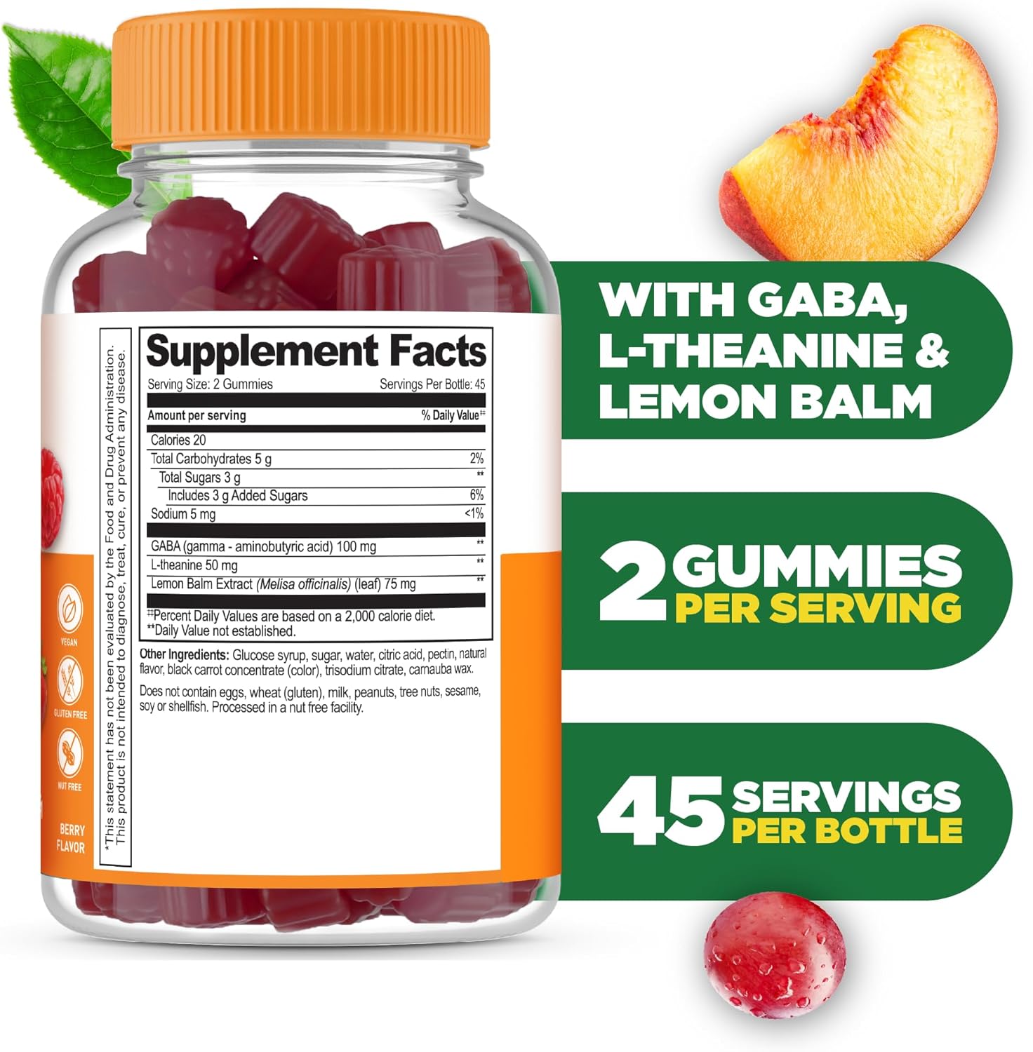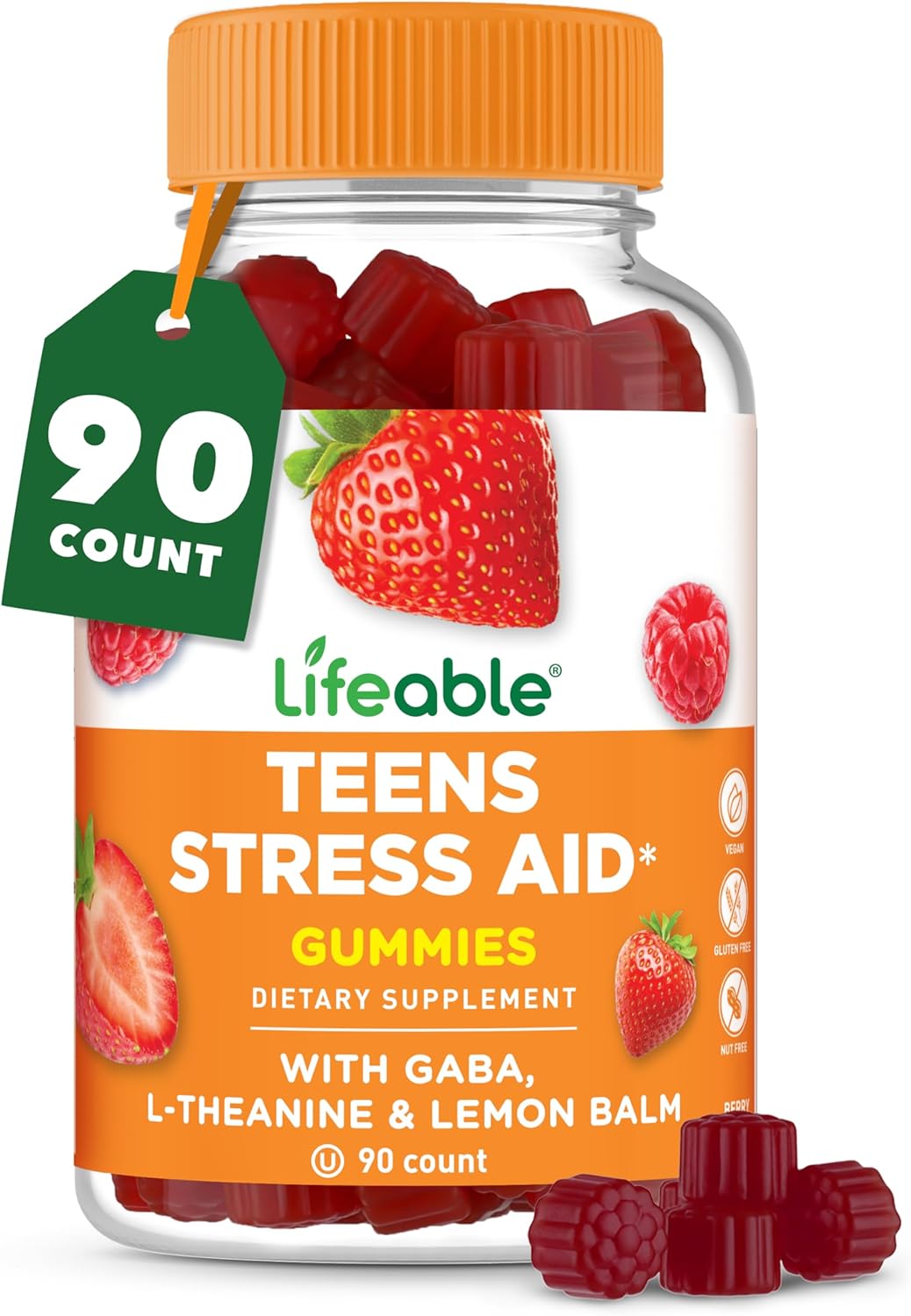 About this item Powerful Stress Aid Blend: Features l theanine supplement for calm focus, Lemon Balm supplement to ease tension, and GABA supplement to quiet the mind, working synergistically to promote relaxation and a healthy stress response. 45 Servings Per Bottle: Each serving consists of gaba 100mg, 50 mg l-theanine supplement and 75 mg lemon balm supplements. A bottle contains 90 stress gummies for teens, with 2 gummies per serving, equaling 45 servings of stress gummies for teenagers. Great Tasting Berry Flavor Gummy: These GABA, Lemon balm and l-theanine gummies for teen boys have a fruity berry flavor everyone loves; they are pleasant and easy to chew; youâll find yourself reaching for more GABA gummies for teen girls. Naturally Sourced and Vegan: These vegetarian ltheanine supplements are non-GMO, gluten-free, and dairy-free. Our gaba l-theanine supplement are free of peanuts and tree nuts, and they are made with natural pectin. Kosher and halal. Doctor Recommended: Lifeable spends thousands of hours on research, testing, and analyzing each of our products. Our entire line of supplements is backed with the approval of a renowned family doctor âș See more product details,Powerful Stress Aid Blend: Features l theanine supplement for calm focus, Lemon Balm supplement to ease tension, and GABA supplement to quiet the mind, working synergistically to promote relaxation and a healthy stress response,45 Servings Per Bottle: Each serving consists of gaba 100mg, 50 mg l-theanine supplement and 75 mg lemon balm supplements. A bottle contains 90 stress gummies for teens, with 2 gummies per serving, equaling 45 servings of stress gummies for teenagers,Great Tasting Berry Flavor Gummy: These GABA, Lemon balm and l-theanine gummies for teen boys have a fruity berry flavor everyone loves; they are pleasant and easy to chew; youâll find yourself reaching for more GABA gummies for teen girls,Naturally Sourced and Vegan: These vegetarian ltheanine supplements are non-GMO, gluten-free, and dairy-free. Our gaba l-theanine supplement are free of peanuts and tree nuts, and they are made with natural pectin. Kosher and halal,Doctor Recommended: Lifeable spends thousands of hours on research, testing, and analyzing each of our products. Our entire line of supplements is backed with the approval of a renowned family doctor