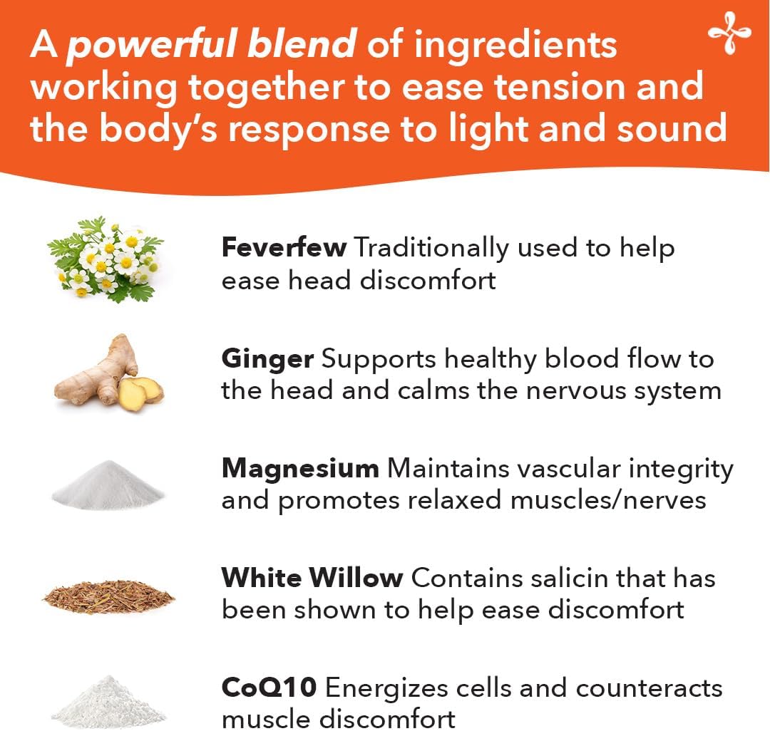 Clinically Tested Ingredients - Crafted with clinically tested ingredients, Migra-T contains natural plant and nutrients like Feverfew, White Willow Bark, Magnesium, Ginger and CoQ10 which have been shown to prevent migraines and headaches