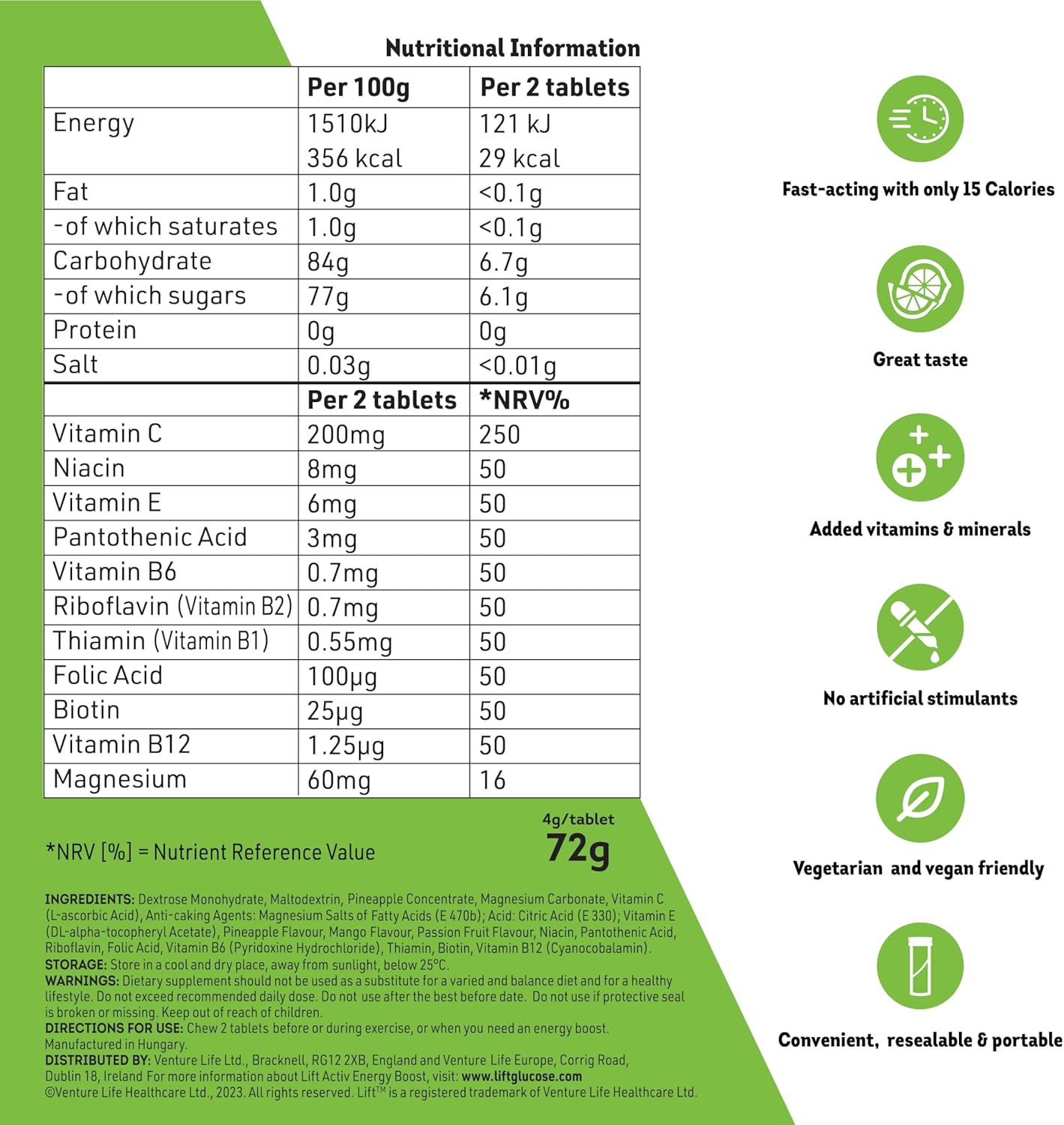 Lift Activ Energy Boosting Glucose Chewable Energy Tablets, Contains Added Multivitamins And Minerals, Fruity Tropical, 1 Pack Of 18-Tablet Tubes