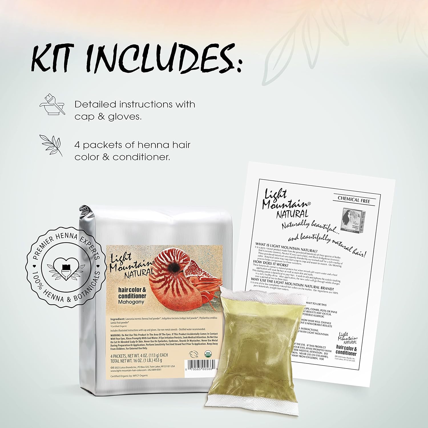 About this item HENNA HAIR COLOR: Light Mountain Natural Hair Color & Conditioner strengthens and nourishes hair while it gently colors. ORGANIC HENNA & BOTANICALS: Organic henna leaf powder, pure botanicals, and nothing else goes into our time-tested hair dyes. CHEMICAL FREE: Our conditioning hair colors are ammonia-free, PPD-free, metallic-salt free, and peroxide-free. VEGAN HAIR COLOR: Cruelty-free, our vegan-friendly, our henna hair color kits are never tested on animals. PREMIER HENNA EXPERTS: At Light Mountain, we've been blending henna-based hair dyes for decades. › See more product details,HENNA HAIR COLOR: Light Mountain Natural Hair Color & Conditioner strengthens and nourishes hair while it gently colors,ORGANIC HENNA & BOTANICALS: Organic henna leaf powder, pure botanicals, and nothing else goes into our time-tested hair dyes,CHEMICAL FREE: Our conditioning hair colors are ammonia-free, PPD-free, metallic-salt free, and peroxide-free,VEGAN HAIR COLOR: Cruelty-free, our vegan-friendly, our henna hair color kits are never tested on animals,PREMIER HENNA EXPERTS: At Light Mountain, we've been blending henna-based hair dyes for decades