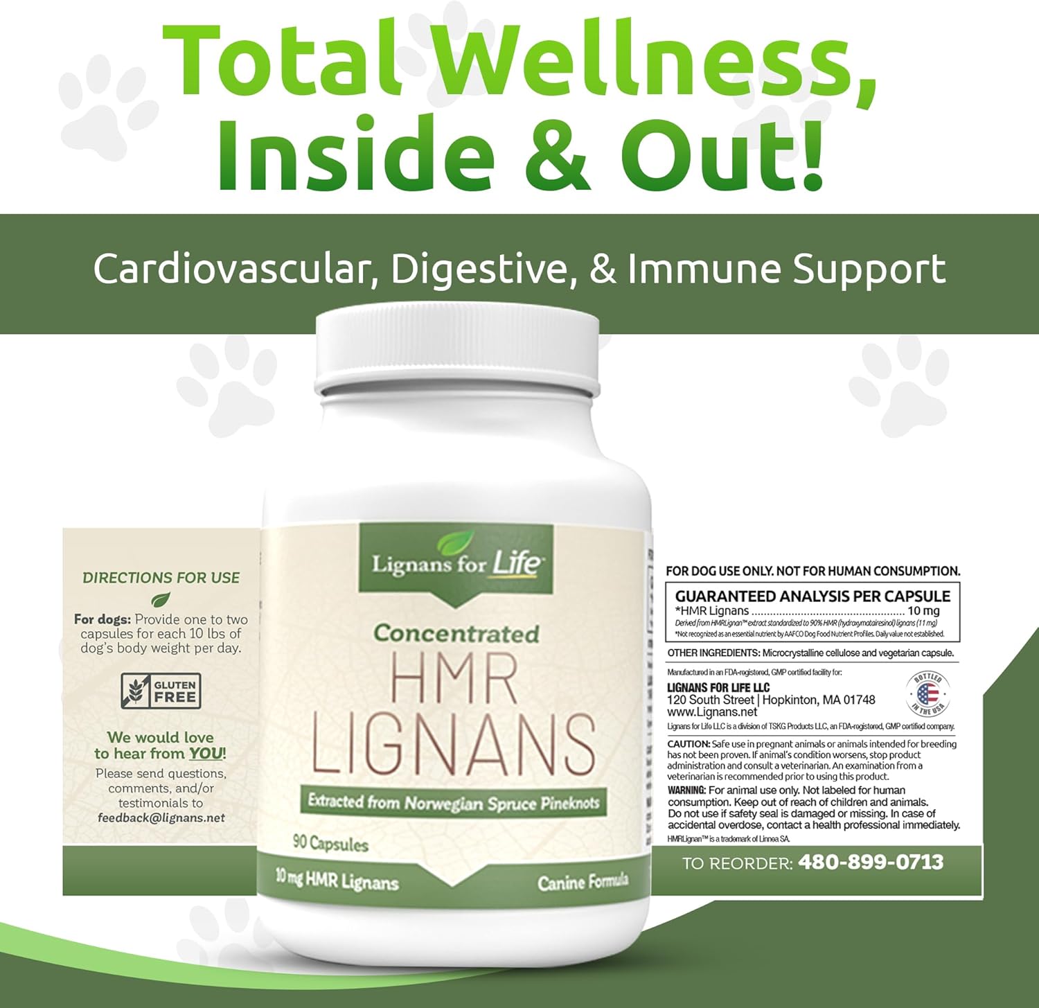 About this item TAILORED DOSAGE FOR MEDIUM BREEDS: Perfectly designed for medium-sized dogs, our 90-tablet bottle delivers a precise 20mg of HMR Lignans per tablet. This ensures tailored and effective support for your dog's specific needs, promoting their optimal health and well-being. PREMIUM NORWEGIAN SPRUCE SOURCE: Extracted from Norwegian Spruce knots, our HMR Lignans feature a 90% purity level. This potent, high-quality source maximizes benefits for your dog's health, offering effective support for vitality, heart health, digestion, skin and coat condition, immune system strength, and overall well-being. COAT AND HEALTH ENHANCEMENT: Enhance your dog's coat, skin, and overall health with our HMR Lignans. These veterinarian-recommended capsules improve coat shine, skin health, vitality, immunity, and wellness, significantly improving your dog's quality of life. HOLISTIC WELLNESS SUPPORT: These natural supplements are formulated to support and enhance cardiovascular health, ensuring your dog's heart remains strong and healthy. Maintain gastrointestinal balance, promoting both digestive regularity and comfort. Additionally, they have the potential to enhance skin and coat health, leaving your dog with a shiny, lustrous appearance. Additionally, they bolster reproductive health and assist in managing stress-related hormones like cortisol. SUITABLE FOR FIBER-SENSITIVE DOGS: Specifically crafted for dogs with fiber sensitivities, our HMR Lignans offer a gentle yet effective solution. This thoughtful formulation ensures digestive comfort and overall well-being, catering to your dog's unique dietary needs. It's a safe and reliable choice for maintaining the health and happiness of your furry friend, even with specific dietary restrictions. › See more product details,TAILORED DOSAGE FOR MEDIUM BREEDS: Perfectly designed for medium-sized dogs, our 90-tablet bottle delivers a precise 20mg of HMR Lignans per tablet. This ensures tailored and effective support for your dog's specific needs, promoting their optimal health and well-being,PREMIUM NORWEGIAN SPRUCE SOURCE: Extracted from Norwegian Spruce knots, our HMR Lignans feature a 90% purity level. This potent, high-quality source maximizes benefits for your dog's health, offering effective support for vitality, heart health, digestion, skin and coat condition, immune system strength, and overall well-being,COAT AND HEALTH ENHANCEMENT: Enhance your dog's coat, skin, and overall health with our HMR Lignans. These veterinarian-recommended capsules improve coat shine, skin health, vitality, immunity, and wellness, significantly improving your dog's quality of life,HOLISTIC WELLNESS SUPPORT: These natural supplements are formulated to support and enhance cardiovascular health, ensuring your dog's heart remains strong and healthy. Maintain gastrointestinal balance, promoting both digestive regularity and comfort. Additionally, they have the potential to enhance skin and coat health, leaving your dog with a shiny, lustrous appearance. Additionally, they bolster reproductive health and assist in managing stress-related hormones like cortisol,SUITABLE FOR FIBER-SENSITIVE DOGS: Specifically crafted for dogs with fiber sensitivities, our HMR Lignans offer a gentle yet effective solution. This thoughtful formulation ensures digestive comfort and overall well-being, catering to your dog's unique dietary needs. It's a safe and reliable choice for maintaining the health and happiness of your furry friend, even with specific dietary restrictions