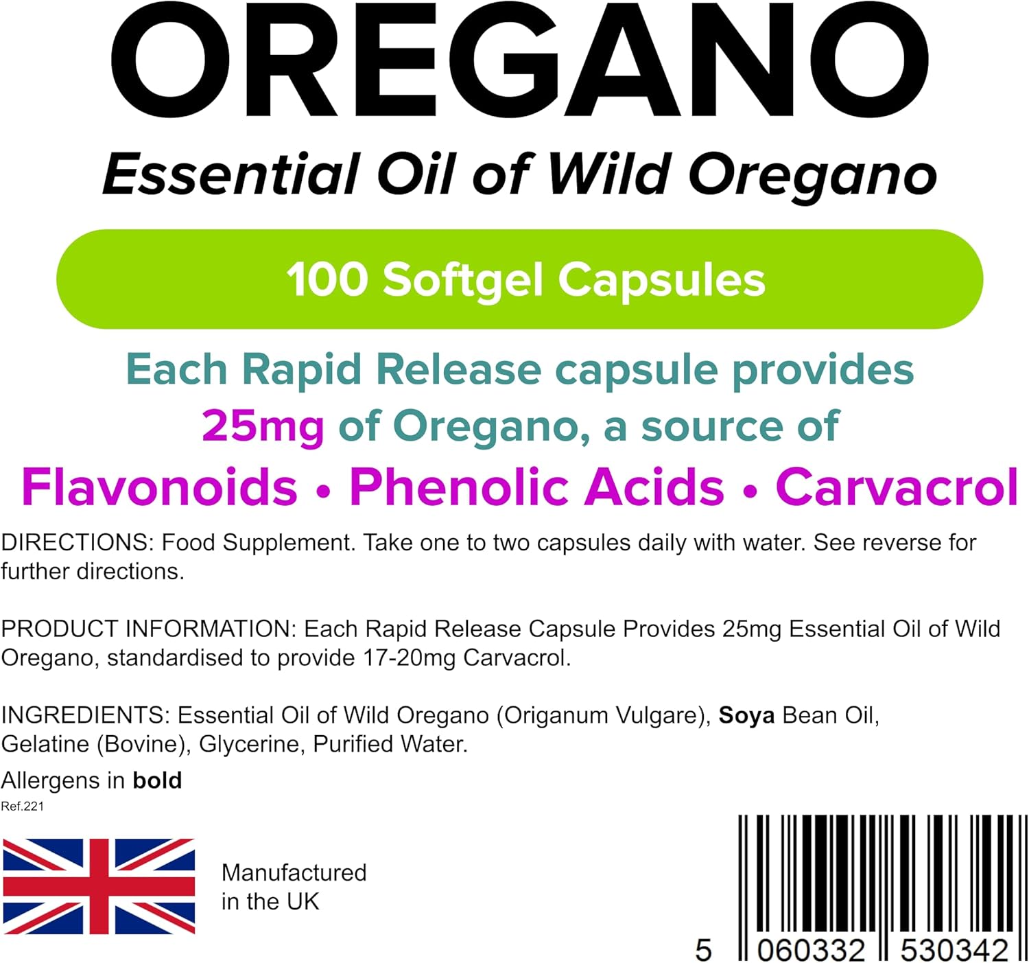 Lindens Oregano Oil 25Mg - 100 Capsules - Uk Made - Natural Source Of Phenolic Acids And Flavonoids - Origanum Vulgare - Easy Swallow & Rapid Release - 3+ Months Supply - Gmp & Letterbox Friendly