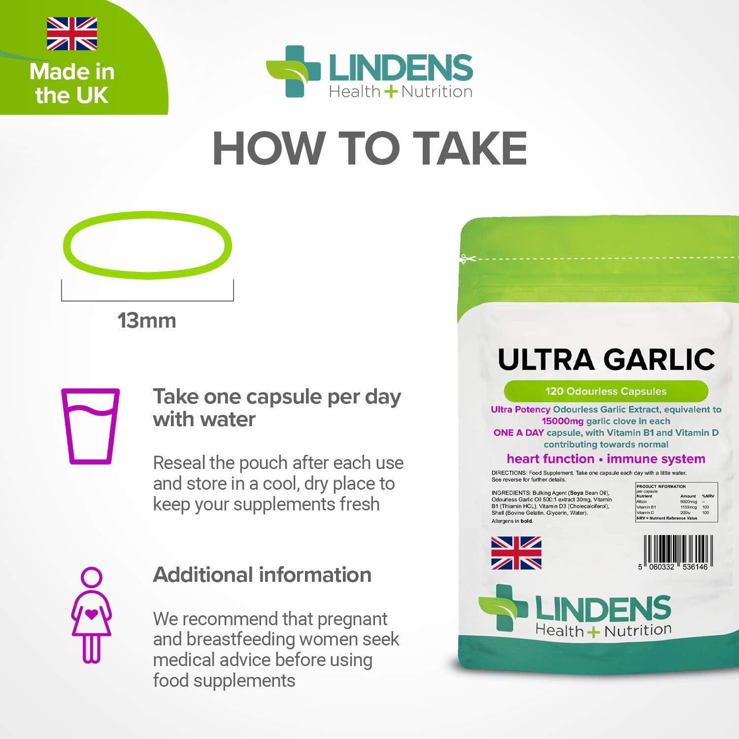 Lindens Ultra Garlic Odourless Capsules - 120 Pack - Vitamin B1 And D3 For Normal Muscle Function, Heart And Immune Health - 15000Mg Garlic (10500Mcg Allicin) - Uk Manufacturer, Letterbox Friendly