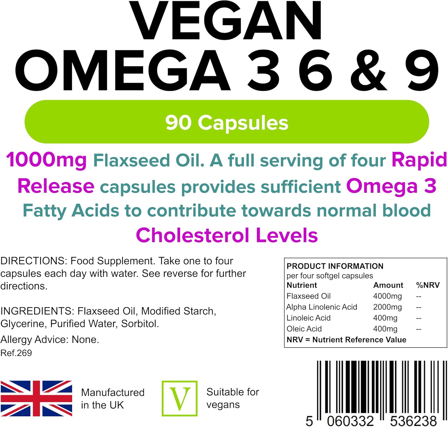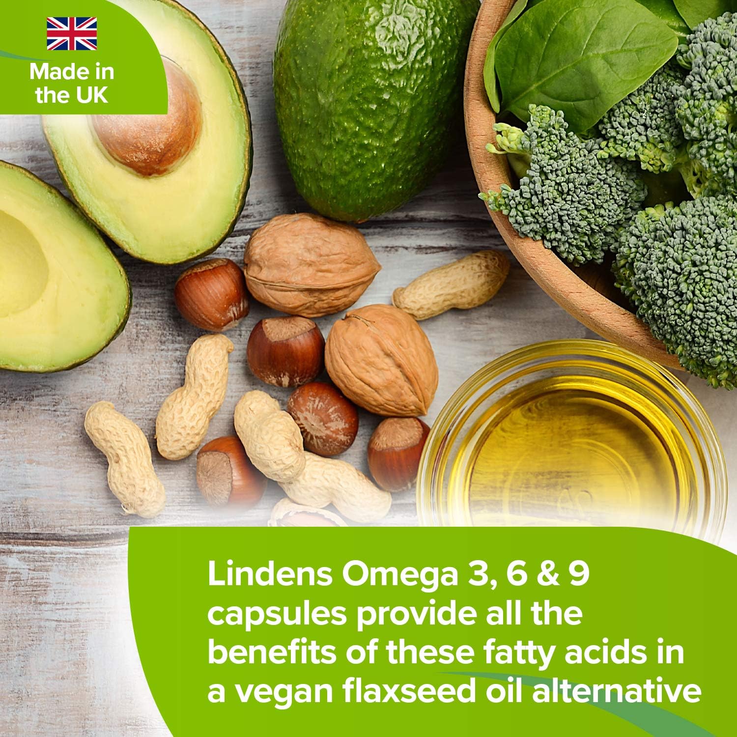 Lindens - Vegan Omega 3, 6 & 9-90 Capsules - 1000Mg Flaxseed Oil, Uk Made - Essential Omega Fatty Acids, Normal Blood Cholesterol Levels - Brain, Heart & Eyes - Letterbox Friendly