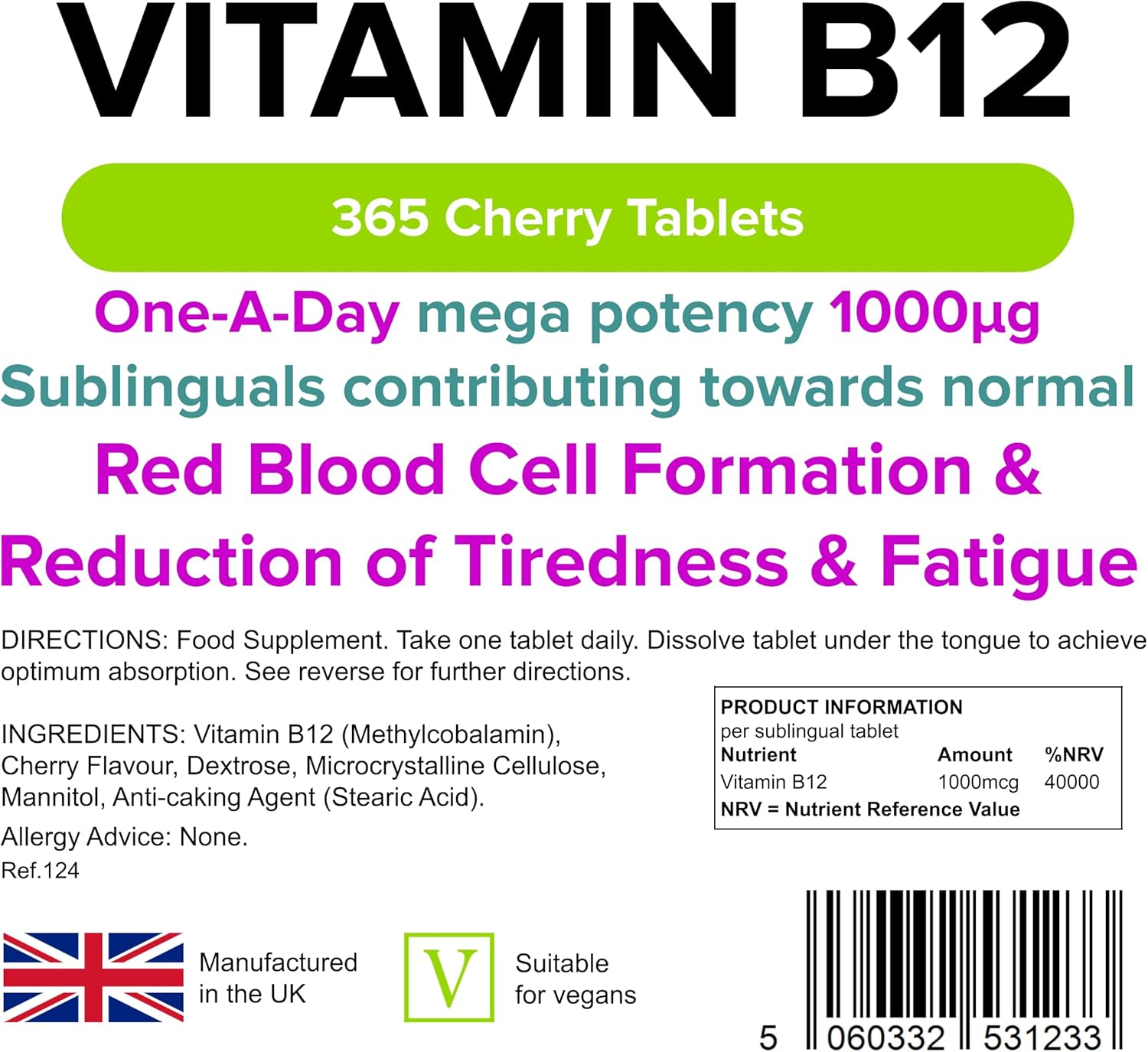 Lindens Vitamin B12 1000Mcg Sublingual Tablets | 365 Pack | Contributing Towards Red Blood Cell Formation, Reduction Of Tiredness & Fatigue