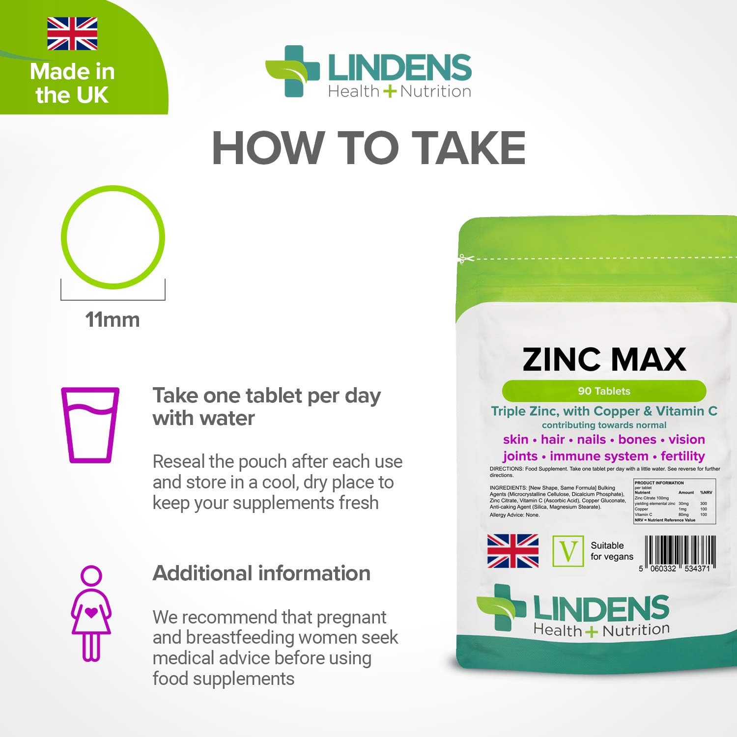 Lindens Zinc Max Tablets - 90 Pack - Provides 300% Nrv Dose, Fortified With Vitamin C & Copper To Contribute Towards Healthy Hair, Skin, Nails, Vision & Hormone Balance - Uk Made, Letterbox Friendly