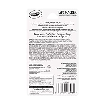 This 3-Piece Pack Of Fun Crayola Themed Lip Smacker Lip Balms Unleash Creative Potential For Boys And Girls Of Any Age. Pick Your Favorite Crayola Color β Each Lip Balm Features One Of Your Favorite Lip Smacker Flavors. Made To Look Like Crayon, These Lip Balms Are Easy To Scribble On Your Lips For Moisturizing, Creative Fun. Welcome To The World Of Lip Smacker: Explore Flavor, Color, And Design And Find The Lip Smacker That Makes You Smile. Since 1973, We Have Put Smiles On Lips Around The Globe. We Hope Our Authentic Flavors, Scents, And Colorfully Designed Products Make You Happy. We Invite You To Discover Our World, Explore Our Brand, And Find Your Favorites. The Flavor Combinations Are Endless β Mix And Match To Find Your Own Lip Softening, Smile Inducing, Deliriously Delicious Happy Moment. Then Repeat, Repeat, Repeat! Flavors: Banana Mania, Pink Sherbert, And Outrageous Orange