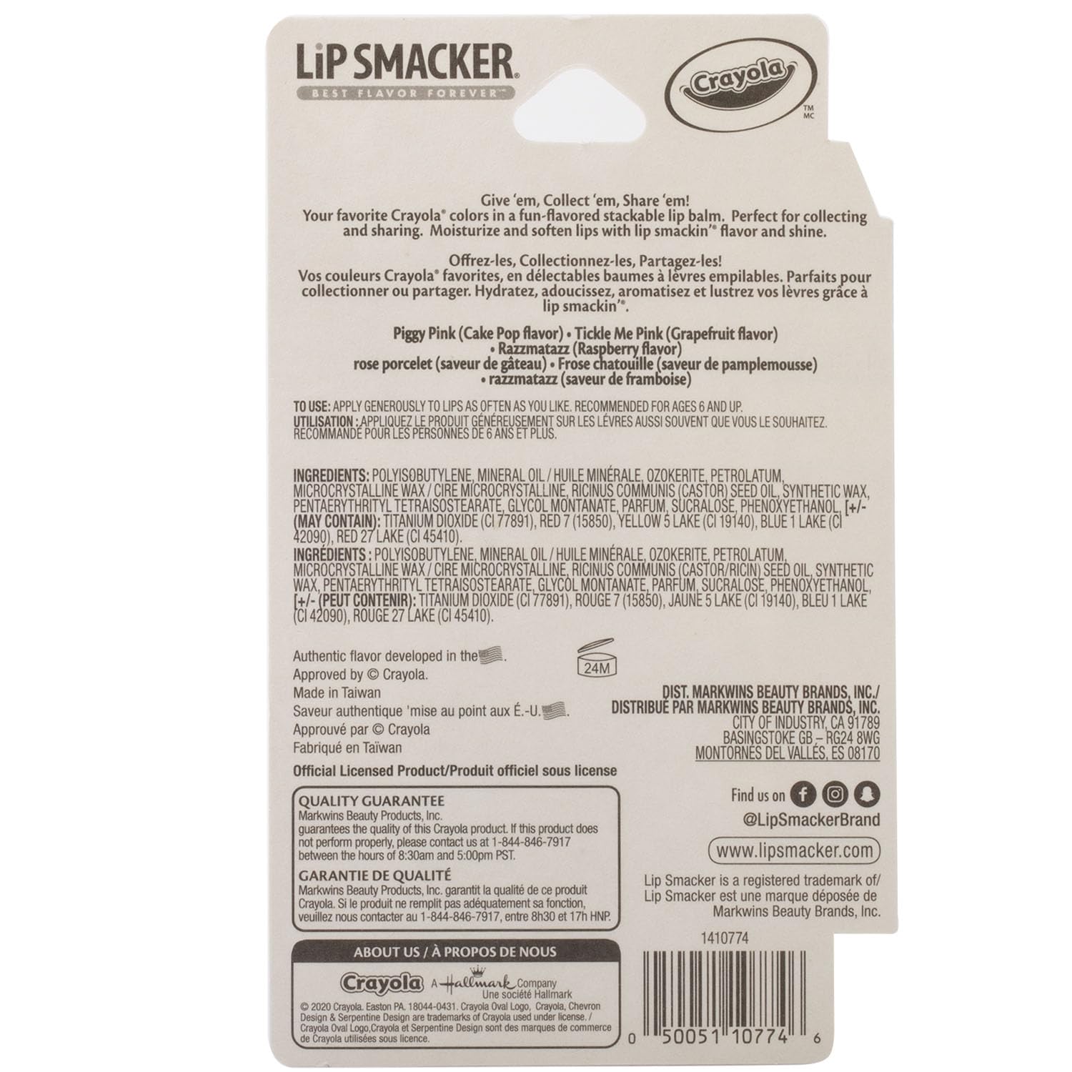 This 3-Piece Pack Of Fun Crayola Crayon Themed Lip Smacker Lip Balms Unleash A Rainbow Of Creative Potential For Boys And Girls Of Any Age. Pick Your Favorite Shade Of Crayola Pink β Each Lip Balm Features One Of Your Favorite Lip Smacker Flavors Like Like Piggy Pink, Tickle Me Pink, And Razzmatazz. These Fat Crayon Lip Balms Are Not Only Stackable, But Also Include A Clip To Hang Them Onto Any Belt Or Backpack. Made To Look Like Crayon, These Lip Balms Are Easy To Scribble On Your Lips For Moisturizing, Creative Fun. When You Reach For A Treat, Reach For The Sweet Taste Of A Lip Smackers Lip Balm. This Pack Features Fun And Flavor Inspired By The Fun And Creativity Of Crayola Crayons. With A Wide Assortment Of Fun Flavors, These Lips Balms Will Leave Your Lips Feeling And Tasting Lip Smackin' Good! With Hundreds Of Flavors And Themes, Lip Smackers Products Are Fun To Use And Even More Fun To Collect. Explore The World Of Lip Smacker And Grow Your Collection! Welcome To The World Of Lip Smacker: Explore Flavor, Color, And Design And Find The Lip Smacker That Makes You Smile. Since 1973, We Have Put Smiles On Lips Around The Globe. We Hope Our Authentic Flavors, Scents, And Colorfully Designed Products Make You Happy. We Invite You To Discover Our World, Explore Our Brand, And Find Your Favorites. The Flavor Combinations Are Endless β Mix And Match To Find Your Own Lip Softening, Smile Inducing, Deliriously Delicious Happy Moment. Then Repeat, Repeat, Repeat! Flavors Included: Piggy Pink β Cake Pop Tickle Me Pink β Grapefruit Razzmatazz β Raspberry