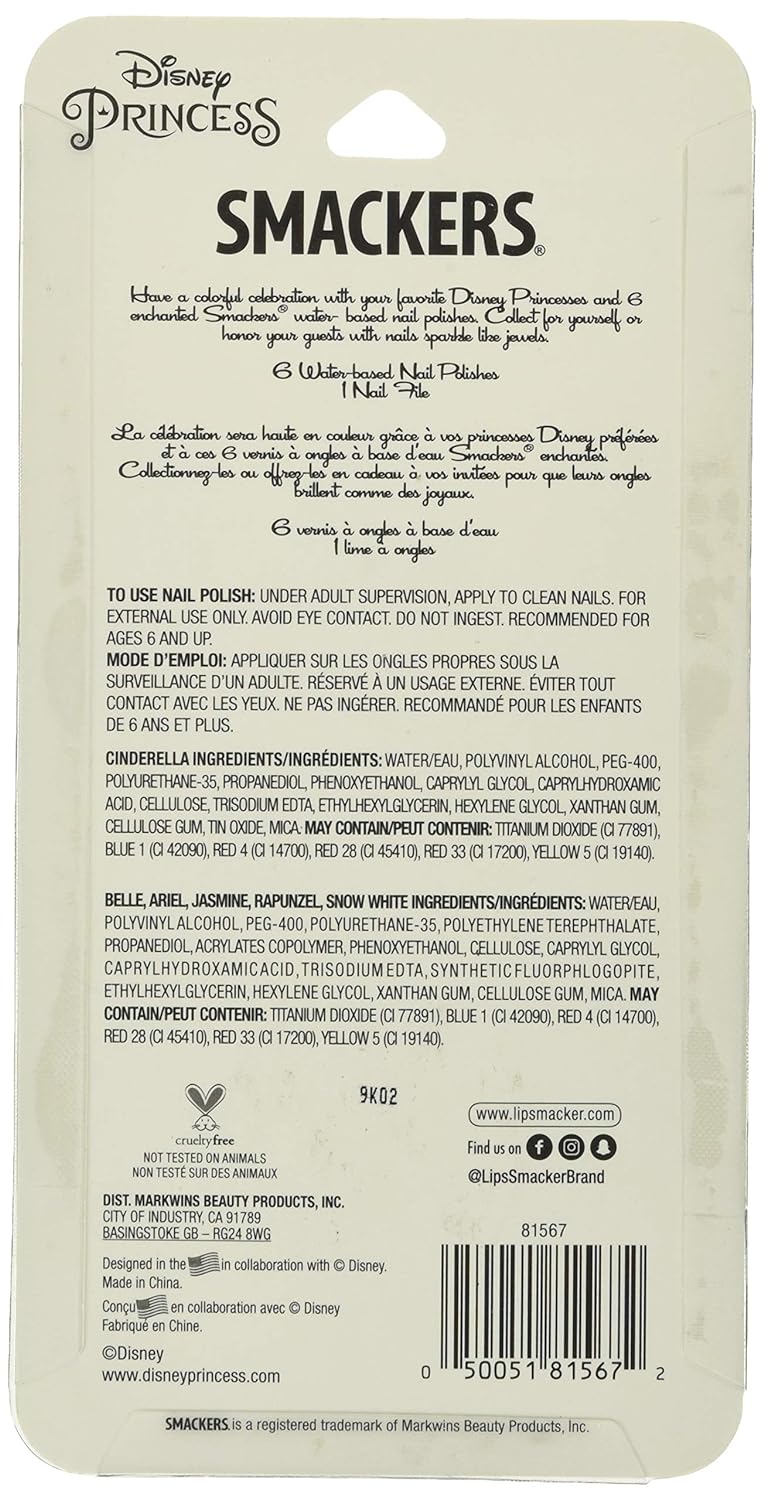 Have A Colorful Celebration With Your Favorite Disney Princesses And 6 Enchanted Smackers Water-Based Nail Polishes. Collect For Yourself Or Honor Your Guests With Nails That Sparkle Like Jewels. Includes: 6 Water-Based Nail Polishes And 1 Nail File