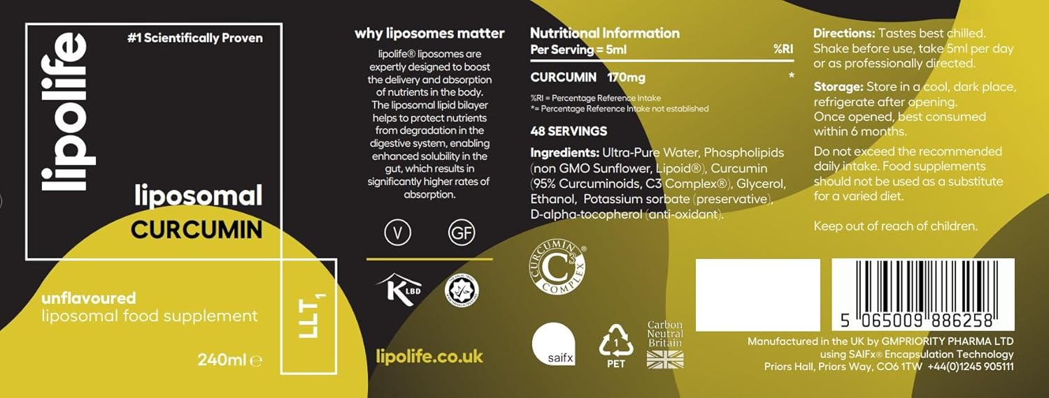 About this item HIGH STRENGTH LIQUID LIPOSOMAL CURCUMIN - Each 5ml liquid serving contains 170mg of Curcumin (95% Curcuminoids, C3 Complex). C3 Complex is the foremost clinically-studied natural anti-inflammatory and antioxidant. It is an extract derived from the roots of the plant Curcuma longa, also known as turmeric and standardized for minimum 95% Curcuminoids LIPOSOMAL ENCAPSULATION TECHNOLOGY (LET) - lipolife uses an innovative delivery mechanism for oral supplements. It is used to transfer nutrients to areas of the body where they are most needed, at cellular level, and with maximum absorption STABILITY AND BIOAVAILABILITY - lipolife liposomal encapsulation provides increased stability to nutrients, protecting them from breakdown and degradation due to stomach acid or enzymes. 30 YEARS OF EXPERIENCE - Each step of the manufacturing process is managed by experts with over 30 years of experience in liposomal nutrient delivery. VEGAN, SOY FREE, GMO FREE, GLUTEN FREE, SUGAR FREE β Our liposomal Curcumin contains no dairy, gluten, soy, or GMO ingredients. TAKE 5ML A DAY - Infused with C3 Complex. Enjoy straight from the bottle or add to water, smoothies. See more product details,HIGH STRENGTH LIQUID LIPOSOMAL CURCUMIN - Each 5ml liquid serving contains 170mg of Curcumin (95% Curcuminoids, C3 Complex). C3 Complex is the foremost clinically-studied natural anti-inflammatory and antioxidant. It is an extract derived from the roots of the plant Curcuma longa, also known as turmeric and standardized for minimum 95% Curcuminoids,LIPOSOMAL ENCAPSULATION TECHNOLOGY (LET) - lipolife uses an innovative delivery mechanism for oral supplements. It is used to transfer nutrients to areas of the body where they are most needed, at cellular level, and with maximum absorption,STABILITY AND BIOAVAILABILITY - lipolife liposomal encapsulation provides increased stability to nutrients, protecting them from breakdown and degradation due to stomach acid or enzymes,30 YEARS OF EXPERIENCE - Each step of the manufacturing process is managed by experts with over 30 years of experience in liposomal nutrient delivery,VEGAN, SOY FREE, GMO FREE, GLUTEN FREE, SUGAR FREE β Our liposomal Curcumin contains no dairy, gluten, soy, or GMO ingredients,TAKE 5ML A DAY - Infused with C3 Complex. Enjoy straight from the bottle or add to water, smoothies