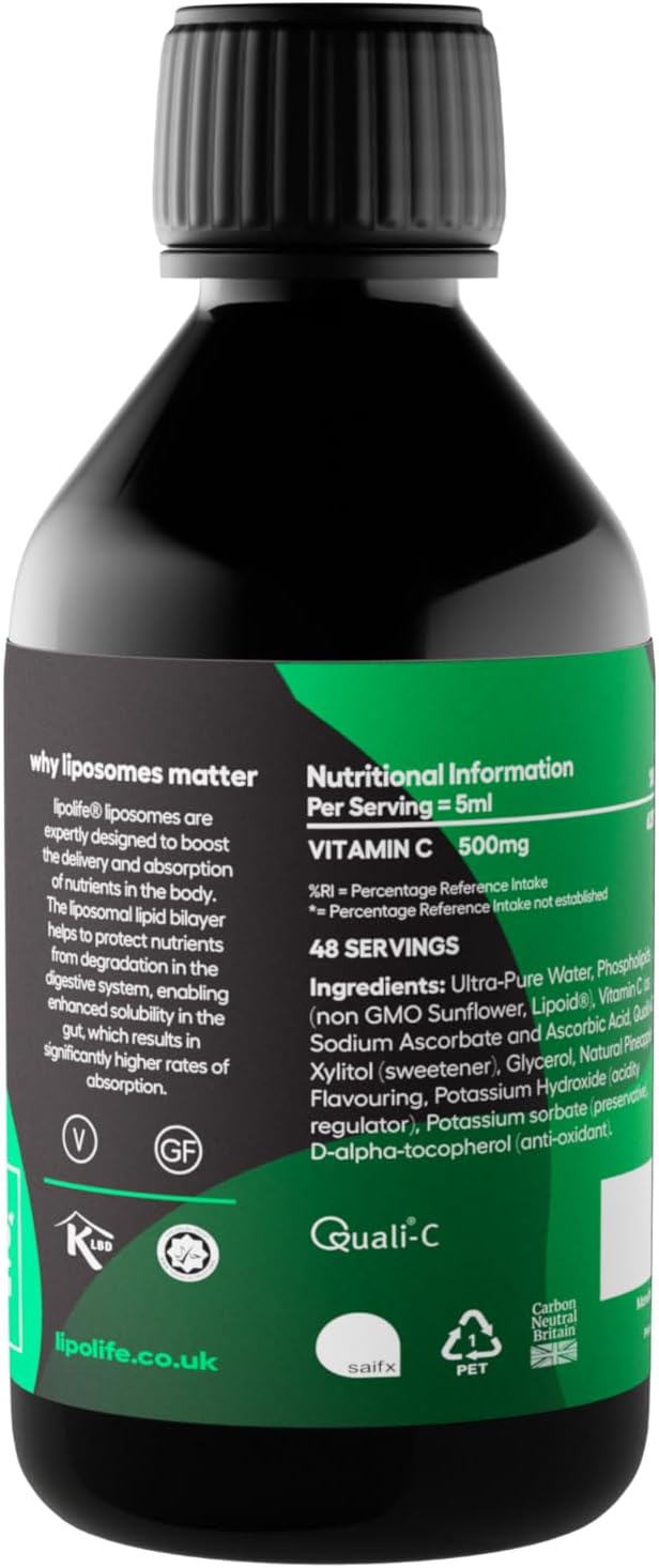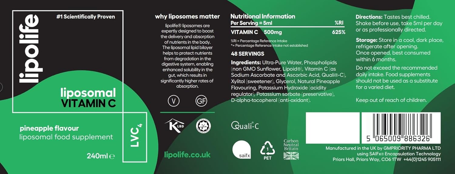 Lipolife - Liposomal Vitamin C 500Mg | High Strength | 48 Servings | Lvc4 | Higher Absorption, Scientifically Proven | Pineapple Flavour | Advanced Nutrient Delivery | Made In Uk |