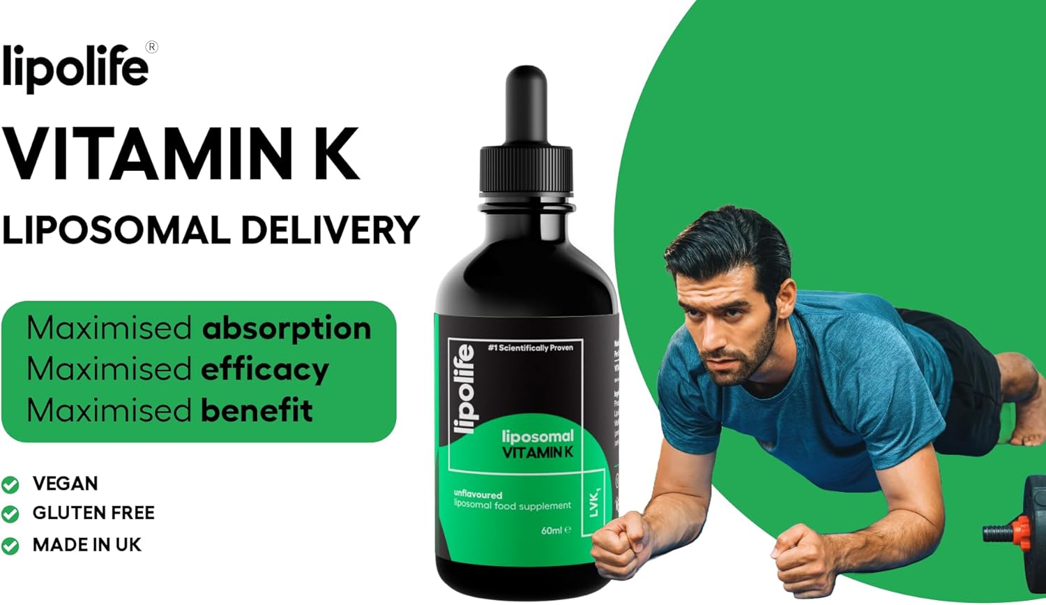 Lipolife Liposomal Vitamin K2 (Mk-7: Menaquinone 7, A Form Of K2) Lvk1 Vegan Friendly, Unflavoured And Unsweetened 60 Servings (Supports Cardiovascular And Bone Health)