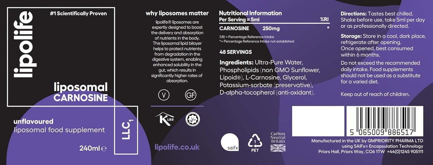 Liposomal Carnosine. Unflavoured Liquid, Gluten Free, Vegan. Advanced Antioxidant With Higher Absorption. 240Ml. Lipolife Llc1
