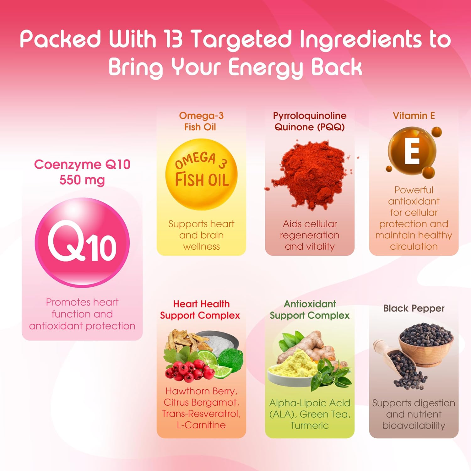 PROMOTE HEART WELLNESS: CoQ10 combines with Omega-3 Fish Oil, Hawthorn Berry and more help support steady energy, healthy circulation, and a strong, active lifestyle. Designed to help you feel less fatigue, enjoy better stamina, and maintain overall vitality each day