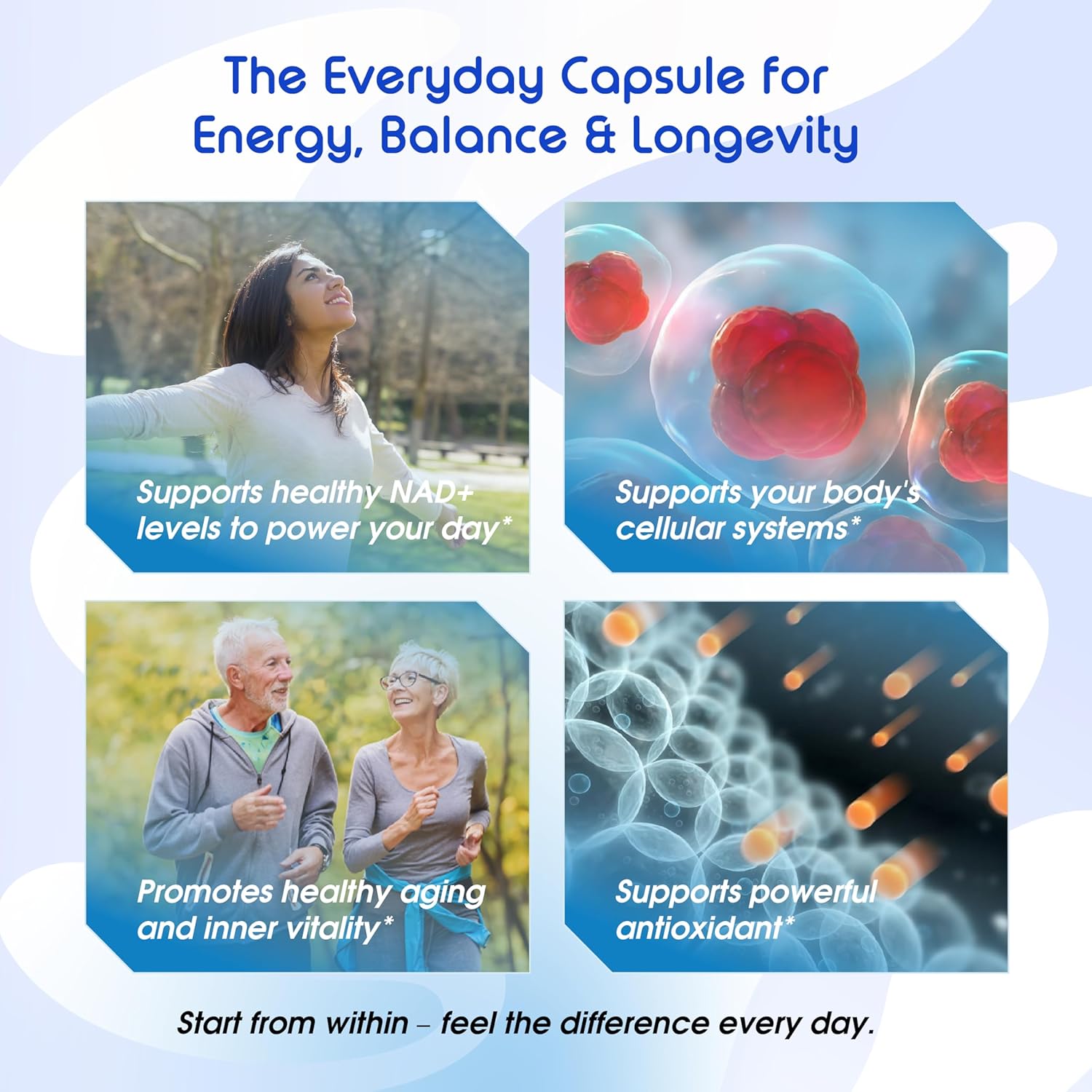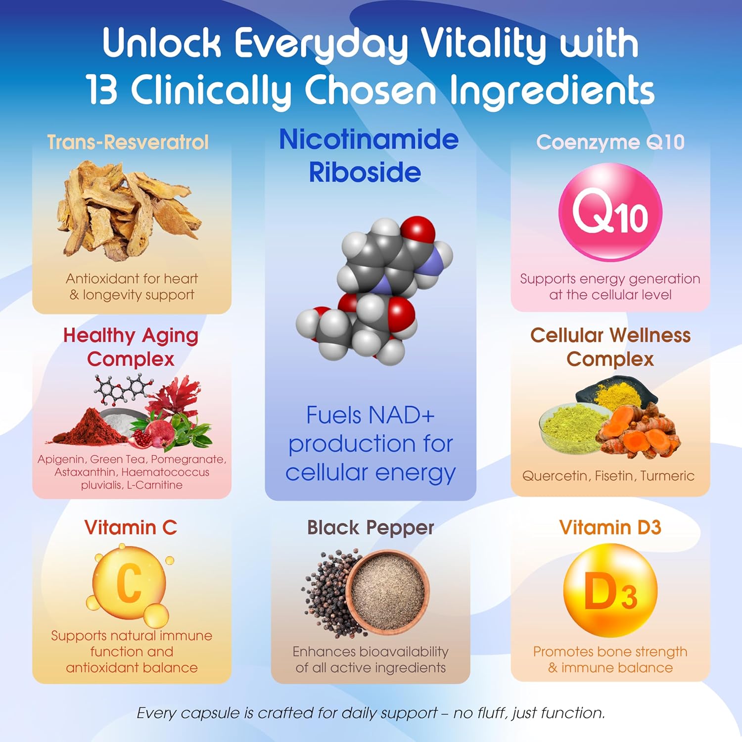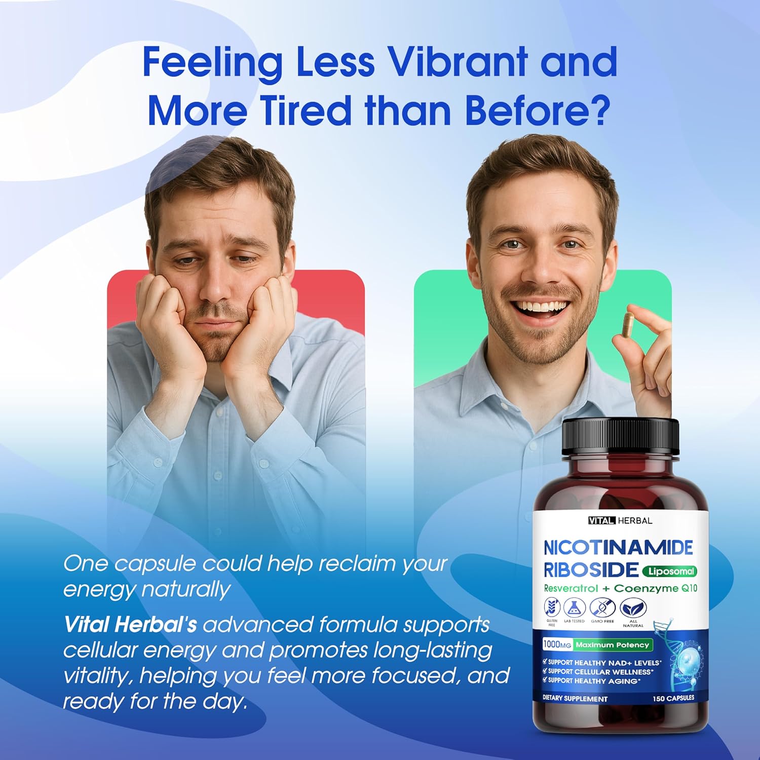 14-in-1 LIPOSOMAL BLEND: Packed with 1000 mg of Nicotinamide Riboside, Trans-resveratrol, Coenzyme Q10 and other powerful ingredients, Vital Herbal supplement supports cellular energy, healthy aging, and healthy NAD+ levels. Made in the USA with premium quality