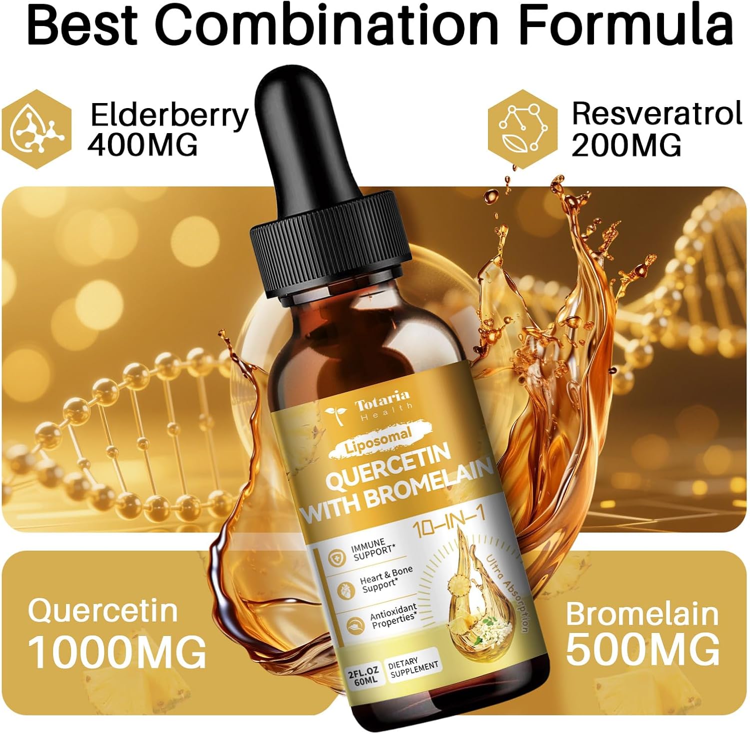About this item BEST COMBINATION - The perfect combination of quercetin 1000mg and bromelain 500mg with elderberry, vitamin C, zinc and other premium ingredients. It can strengthen the immune system, support joint health and sports recovery. It is perfect for seasonal challenges or daily health maintenance. IMMUNE SUPPORT - Enhance your natural defenses with science-backed ingredients! Quercetin with Bromelain Supplement Liquid Drops formula combines Quercetin with Bromelain, two powerful compounds that support healthy immune function, bromelain for bruising and swelling. POWERFUL ANTIOXIDANT - Neutralizes free radicals to support cellular health! Our Quercetin with Bromelain Liquid Drops are rich in quercetin zinc and digestive enzymes to support antioxidants and aid digestion. 4 TIMES HIGHER ABSORPTION - Liposomal quercetin makes the absorption rate 4 times higher than quercetin capsules and gummies. No need to wait, just take it directly under the tongue or put it in water or juice for fast relief. EASY TO TAKE - Take 2ml per day for a total of 30 days. Natural pineapple extract flavor, no bitter aftertaste!Suitable for men and women,children. you can carry it with you to easily help you develop good healthy habits. BRAND EXCLUSIVE PERFECT SERVICE - Our drops are strictly tested and safely packaged. If you have any questions, please contact our after-sales support team, we will be online 24/7 and strive to solve the problem within 12 hours. Your health is our top priority. See more product details,BEST COMBINATION - The perfect combination of quercetin 1000mg and bromelain 500mg with elderberry, vitamin C, zinc and other premium ingredients. It can strengthen the immune system, support joint health and sports recovery. It is perfect for seasonal challenges or daily health maintenance,IMMUNE SUPPORT - Enhance your natural defenses with science-backed ingredients! Quercetin with Bromelain Supplement Liquid Drops formula combines Quercetin with Bromelain, two powerful compounds that support healthy immune function, bromelain for bruising and swelling,POWERFUL ANTIOXIDANT - Neutralizes free radicals to support cellular health! Our Quercetin with Bromelain Liquid Drops are rich in quercetin zinc and digestive enzymes to support antioxidants and aid digestion,4 TIMES HIGHER ABSORPTION - Liposomal quercetin makes the absorption rate 4 times higher than quercetin capsules and gummies. No need to wait, just take it directly under the tongue or put it in water or juice for fast relief,EASY TO TAKE - Take 2ml per day for a total of 30 days. Natural pineapple extract flavor, no bitter aftertaste!Suitable for men and women,children. you can carry it with you to easily help you develop good healthy habits,BRAND EXCLUSIVE PERFECT SERVICE - Our drops are strictly tested and safely packaged. If you have any questions, please contact our after-sales support team, we will be online 24/7 and strive to solve the problem within 12 hours. Your health is our top priority