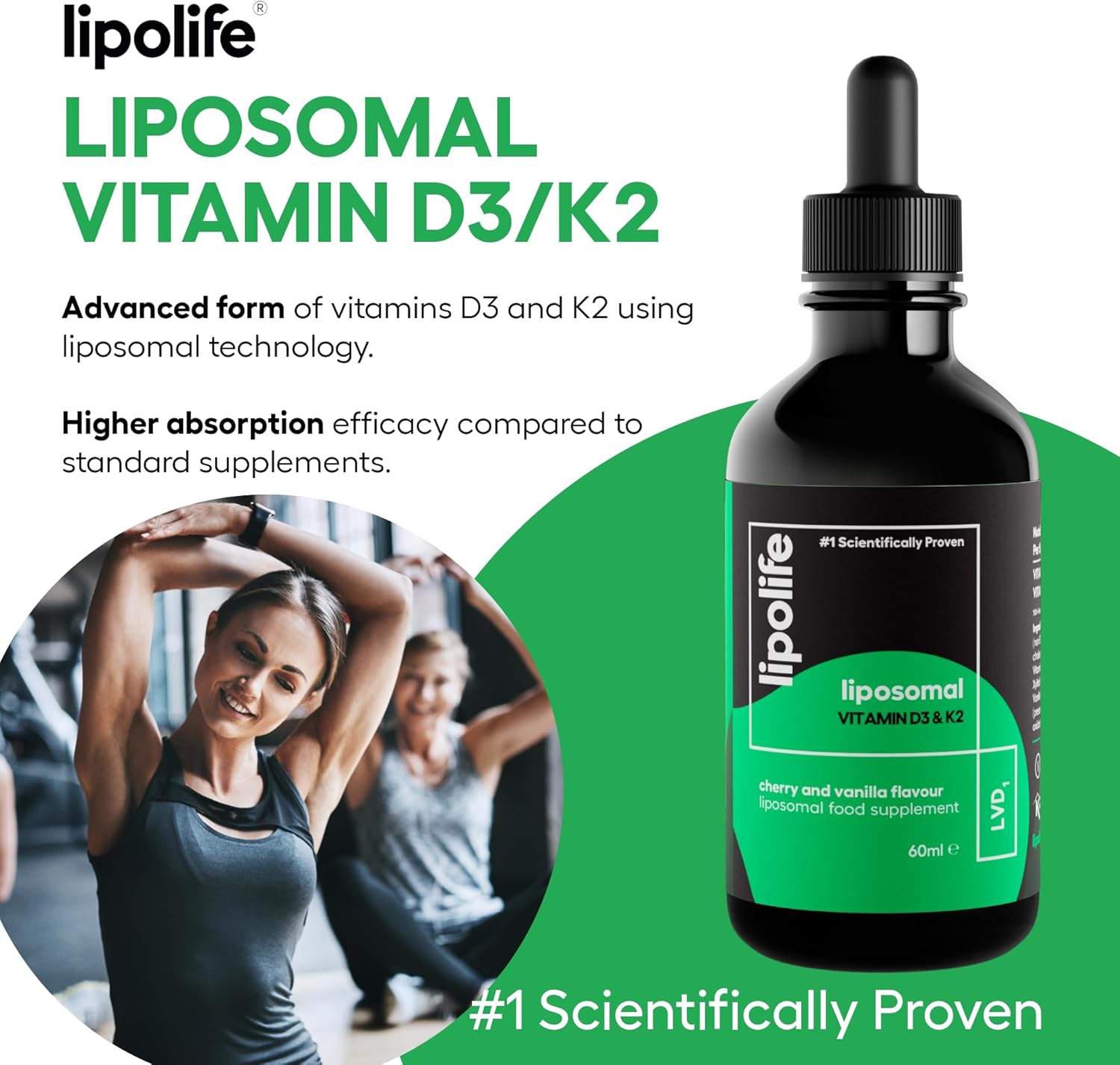 Liposomal Vegan Vitamin D3 And Vitamin K2 Liquid - Cherry & Vanilla Flavour. Advanced Nutrient Absorption. Made In The Uk. 60 Servings. Lipolife Lvd1