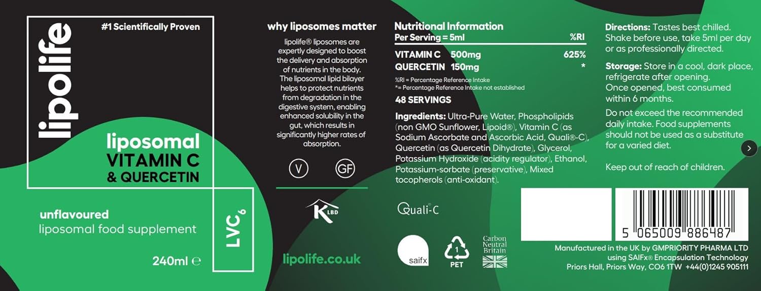 Liposomal Vitamin C And Quercetin - 240Ml - Lipolife, Lvc6. Advanced Nutrient Delivery Support For Seasonal Discomfort Such As Hayfever Or Similar Histamine Response