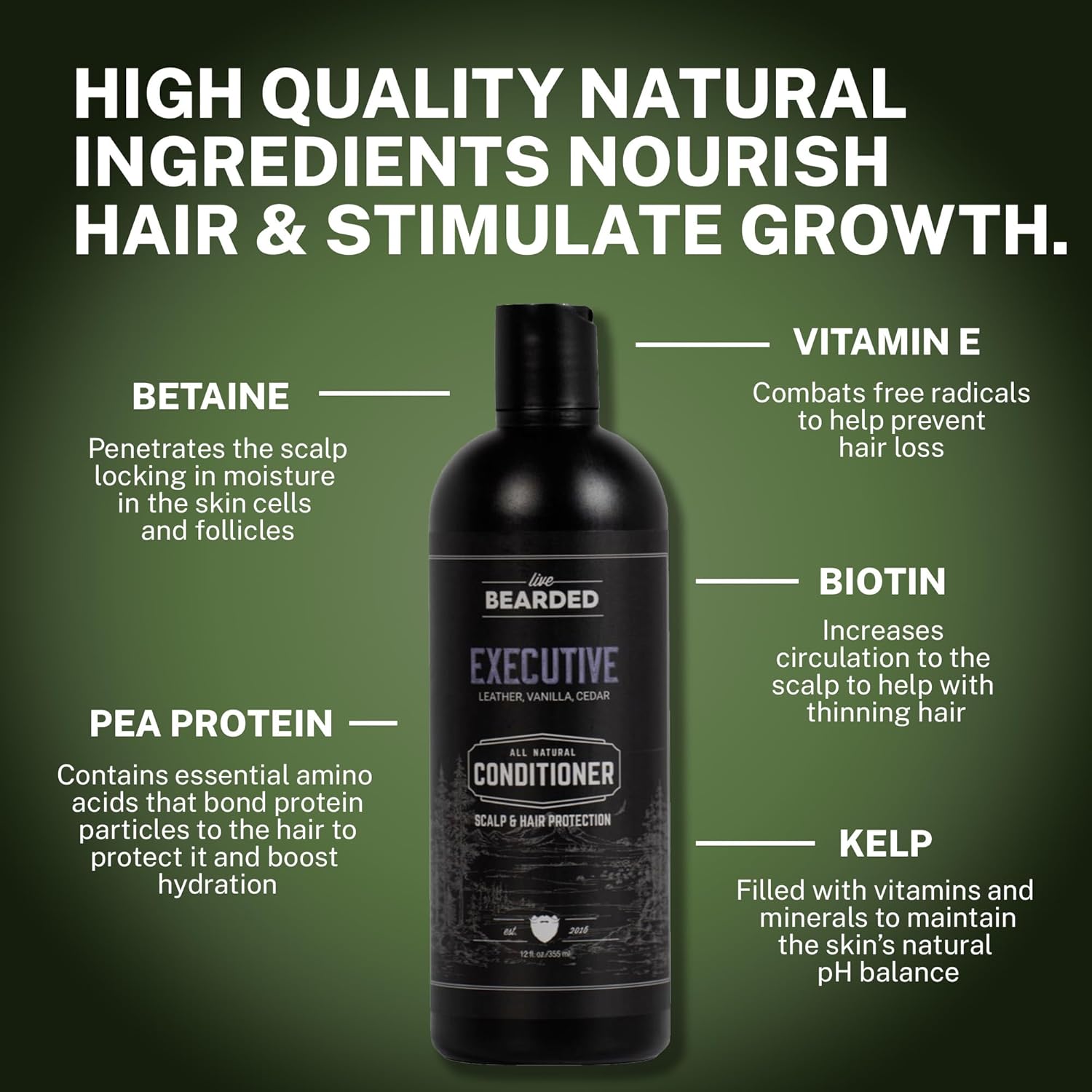 Grooming Goes Beyond the Beard Live Bearded All-Natural Conditioner is formulated with special attention to focus on common hair concerns for men. Hair wellness begins with the scalp and our proprietary blend of key ingredients prioritize scalp health while still offering the expected moisturizing benefits of conditioner. How does this differ from our beard wash and conditioner It boils down to the ingredients. The hair and skin on your head is very different from the hair and skin on your beard - the pores on your face are 5x bigger than on your scalp so we took the same intentionality behind our beard products and formulated our conditioner with scalp health in mind. Our complex collection of ingredients work together to fight hair loss and support the health of your scalp, fostering a favorable environment for healthier hair. Our formulation includes Betaine, an excellent hydrating agent for skin cells and hair follicles. Pea protein is also part of our formula. It contains essential amino acids that help bond protein particles to the hair while protecting and boosting hydration, also increasing moisture retention to each hair strand, ultimately helping to improve hair growth and may reduce hair loss and improve hair density. Turning to the sea for inspiration, weāve included kelp since itās filled with vitamins and minerals that help maintain the skin's natural pH balance while promoting skin hydration, shine, and stronger hair. All-Natural Ingredients There are plenty of junk products on the market using synthetic ingredients, and harmful chemicals. And we hate seeing this. We believe what you put on and in your body should be of the highest-quality natural ingredients made right here in America. Our all-natural conditioner for men has no synthetic chemicals, harmful ingredients or funny business. Just good, all-natural vitamins, minerals, and essential oils,Made for men like you: Letās get to the root of the problem: Healthy hair starts at the scalp. Our naturally-derived conditioner is specially formulated to help with thinning hair and hair loss by focusing on scalp health. Team it up with our shampoo for a full hair care routine,Soft yet strong hair: Designed to deeply condition and nourish your hair, while protecting it from environmental damage, ultimately improving scalp health, strengthening hair and stimulating growth,Helps promote hair growth: Get visibly healthier hair and fight hair loss with our high-performing formula that includes growth-boosting ingredients like kelp, biotin, caffeine, and vitamin E,Natural ingredients: We believe what you put on and in your body should be of the highest-quality natural ingredients made in America. No synthetic chemicals or harmful ingredients here,Smell good from head to toe: Our quality conditioner can handle anything you throw at it, but still leave you smelling like a man. When you finally get that reservation at Dorsia, you can count on Executive to live up to the occasion. Leather, vanilla, and cedar combine for an aromatic shampoo thatās as bold as your grindset