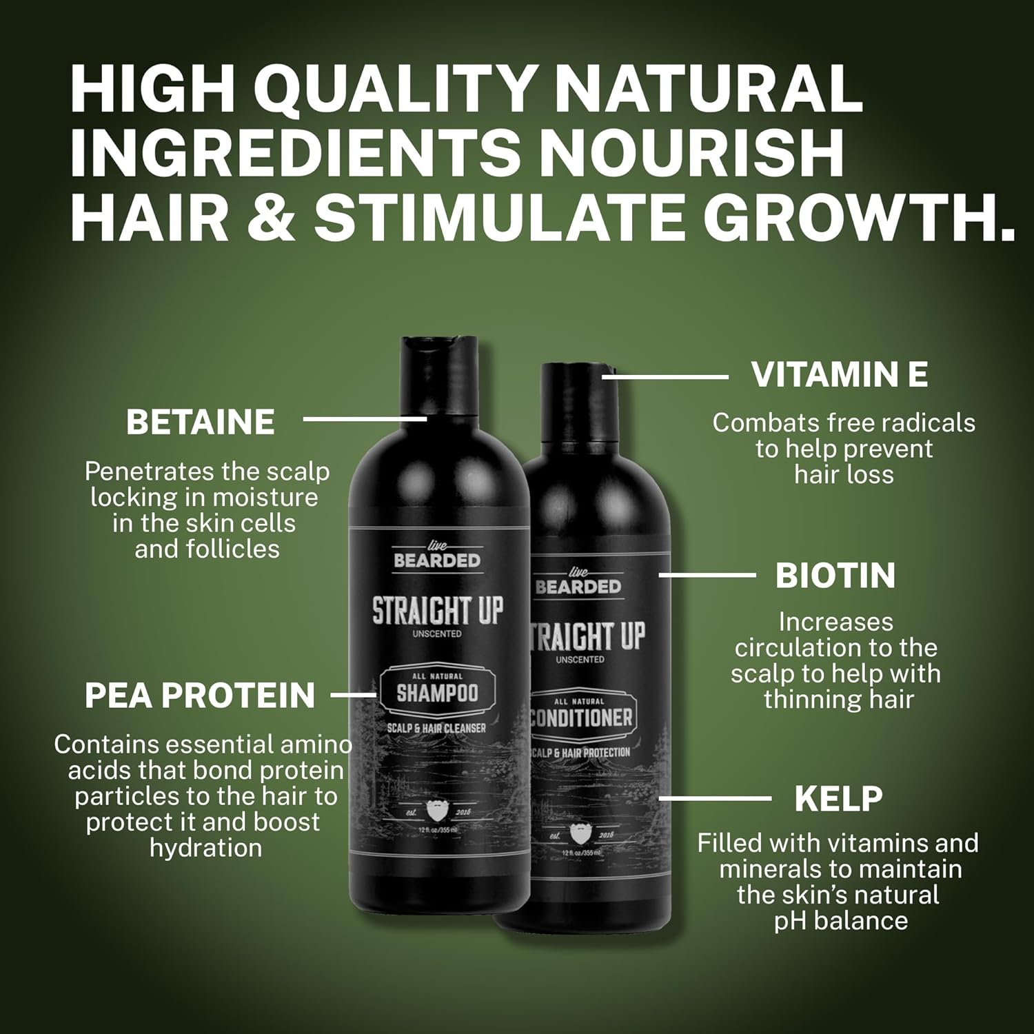 Grooming Goes Beyond the Beard Live Bearded All-Natural Shampoo and Conditioner are formulated with special attention to focus on common hair concerns for men. Hair wellness begins with the scalp and our proprietary blend of key ingredients prioritize scalp health while still offering the expected cleaning benefits of shampoo and moisturizing benefits of conditioner. How does this differ from our beard wash and conditioner It boils down to the ingredients. The hair and skin on your head is very different from the hair and skin on your beard - the pores on your face are 5x bigger than on your scalp so we took the same intentionality behind our beard products and formulated our shampoo and conditioner with scalp health in mind. Our complex collection of ingredients work together to fight hair loss and support the health of your scalp, fostering a favorable environment for healthier hair. Our formulation includes Betaine, an excellent hydrating agent for skin cells and hair follicles. Pea protein is also part of our formula. It contains essential amino acids that help bond protein particles to the hair while protecting and boosting hydration, also increasing moisture retention to each hair strand, ultimately helping to improve hair growth and may reduce hair loss and improve hair density. Turning to the sea for inspiration, weāve included kelp since itās filled with vitamins and minerals that help maintain the skin's natural pH balance while promoting skin hydration, shine, and stronger hair. All-Natural Ingredients There are plenty of junk products on the market using synthetic ingredients, and harmful chemicals - we hate seeing this. We believe what you put on and in your body should be of the highest-quality natural ingredients made right here in America. Our all-natural conditioner for men has no synthetic chemicals, harmful ingredients or funny business. Just good, all-natural vitamins, minerals, and essential oils,Made for men like you: Letās get to the root of the problem: Healthy hair starts at the scalp. Our naturally-derived shampoo and conditioner are specially formulated to help with thinning hair and hair loss by focusing on scalp health,Maintain your mane: Designed to optimize scalp health and strengthen hair while protecting it from environmental damage, our unique blend of natural ingredients nourishes your hair and scalp with vitamins, minerals, and essential oils to help stimulate and promote healthy hair growth,Helps promote hair growth: Get visibly healthier hair and fight hair loss with our high-performing formula that includes growth-boosting ingredients like kelp, biotin, caffeine, and vitamin E,Natural ingredients: We believe what you put on and in your body should be of the highest-quality natural ingredients made in America. No synthetic chemicals or harmful ingredients here,Smell good from head to toe: Our quality shampoo and conditioner can handle anything you throw at it, but still leave you smelling like a man. An aromatic slice of the great outdoors, our Canyon fragrance is made with juniper, cypress, and fir needles. Itās a trip to your favorite camping spot
