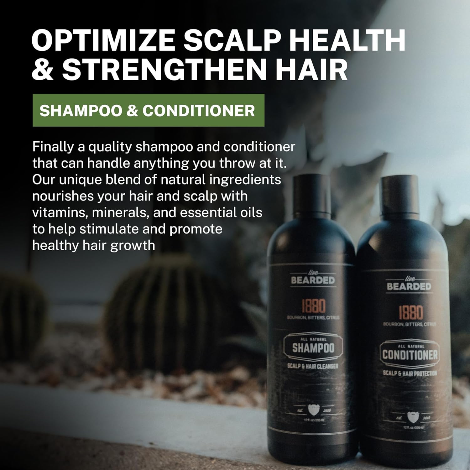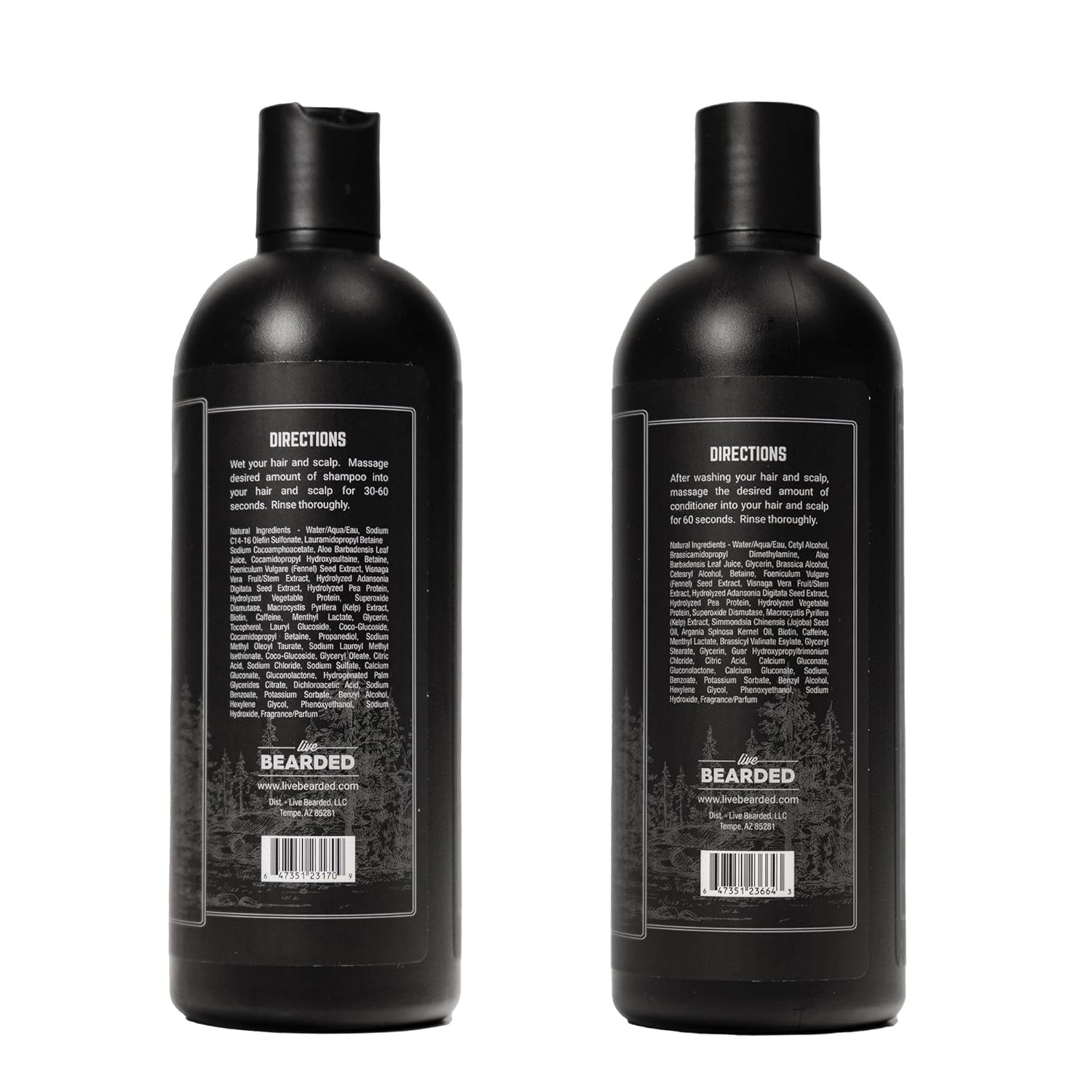 Grooming Goes Beyond the Beard Live Bearded All-Natural Shampoo and Conditioner are formulated with special attention to focus on common hair concerns for men. Hair wellness begins with the scalp and our proprietary blend of key ingredients prioritize scalp health while still offering the expected cleaning benefits of shampoo and moisturizing benefits of conditioner. How does this differ from our beard wash and conditioner It boils down to the ingredients. The hair and skin on your head is very different from the hair and skin on your beard - the pores on your face are 5x bigger than on your scalp so we took the same intentionality behind our beard products and formulated our shampoo and conditioner with scalp health in mind. Our complex collection of ingredients work together to fight hair loss and support the health of your scalp, fostering a favorable environment for healthier hair. Our formulation includes Betaine, an excellent hydrating agent for skin cells and hair follicles. Pea protein is also part of our formula. It contains essential amino acids that help bond protein particles to the hair while protecting and boosting hydration, also increasing moisture retention to each hair strand, ultimately helping to improve hair growth and may reduce hair loss and improve hair density. Turning to the sea for inspiration, weāve included kelp since itās filled with vitamins and minerals that help maintain the skin's natural pH balance while promoting skin hydration, shine, and stronger hair. All-Natural Ingredients There are plenty of junk products on the market using synthetic ingredients, and harmful chemicals - we hate seeing this. We believe what you put on and in your body should be of the highest-quality natural ingredients made right here in America. Our all-natural conditioner for men has no synthetic chemicals, harmful ingredients or funny business. Just good, all-natural vitamins, minerals, and essential oils,Made for men like you: Letās get to the root of the problem: Healthy hair starts at the scalp. Our naturally-derived shampoo and conditioner are specially formulated to help with thinning hair and hair loss by focusing on scalp health,Maintain your mane: Designed to optimize scalp health and strengthen hair while protecting it from environmental damage, our unique blend of natural ingredients nourishes your hair and scalp with vitamins, minerals, and essential oils to help stimulate and promote healthy hair growth,Helps promote hair growth: Get visibly healthier hair and fight hair loss with our high-performing formula that includes growth-boosting ingredients like kelp, biotin, caffeine, and vitamin E,Natural ingredients: We believe what you put on and in your body should be of the highest-quality natural ingredients made in America. No synthetic chemicals or harmful ingredients here,Smell good from head to toe: Our quality shampoo and conditioner can handle anything you throw at it, but still leave you smelling like a man. Served Straight Up, our fragrance-free option is best for sensitive skin