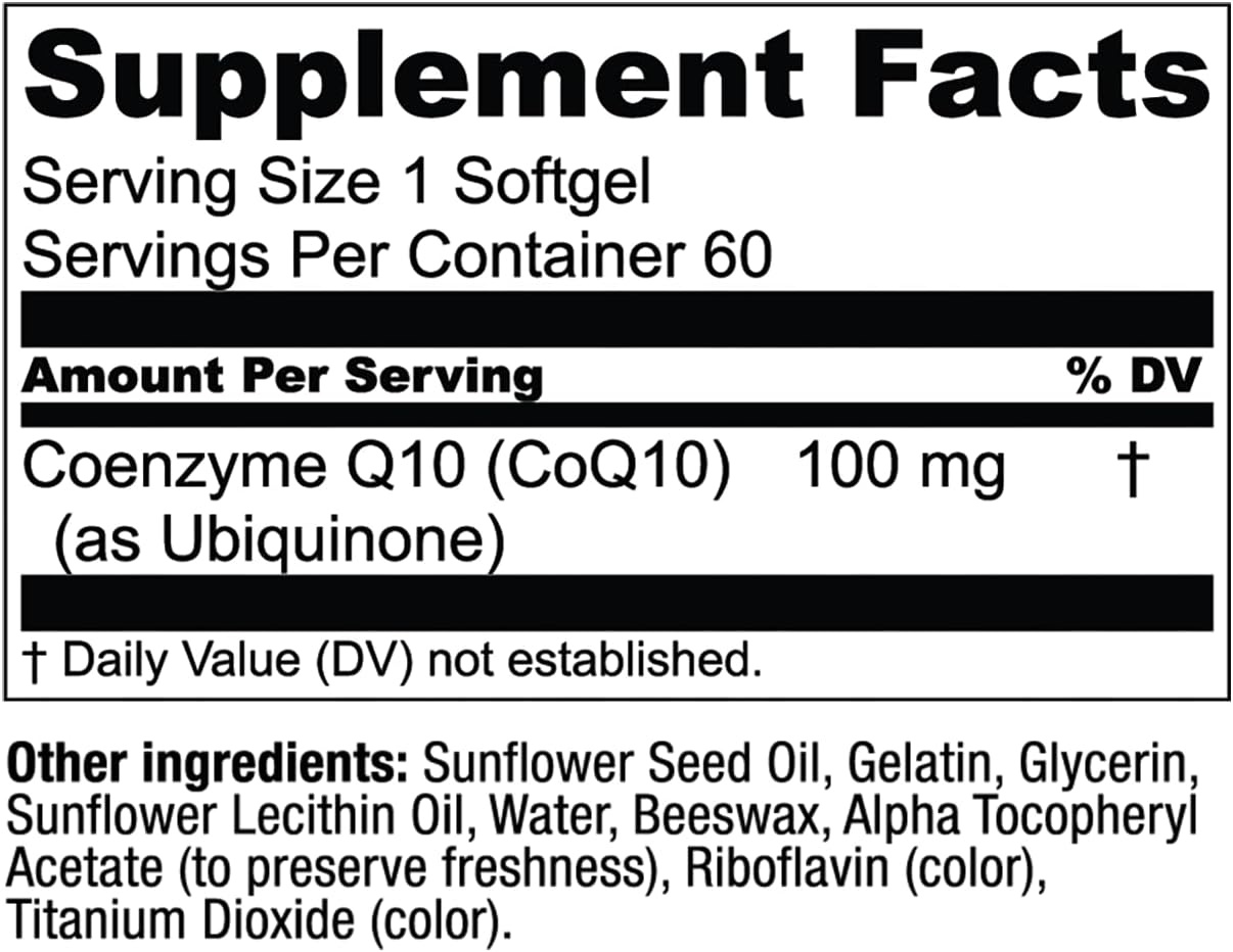 About this item Our Best Quality Coenzyme Q10 Supplement: Our high quality CoQ10 supplement delivers a pure, concentrated dose of coenzyme Q10. Each serving contains 100 mg CoQ10, replenishing the naturally occurring coenzyme in every cell of your body, fighting everyday cellular oxidation and assisting in brain, heart and bone health.* Heart Health and Energy Support: Coenzyme Q10, recognized for its antioxidant properties and ability to provide energy to cells, helps maintain cardiovascular and heart health already within a normal range.* Taking 100 mg a day of CoQ10 has been found to promote a healthy metabolism, strong bones, youthful skin, healthy tissue, and helps to support muscle strength and blood pressure that is already within a normal range.* Immune Supporter: Co Q10 maintains cellular energy levels for the immune system, which is highly energy dependent and requires an adequate amount of CoQ10 to function optimally.* High Quality Ingredients Deliver Real Results: CoQ10 as ubiquinone is an oil-based formulation of coenzyme Q10, designed to support efficient absorption.* Our potent CoQWell formula protects cell health and promotes cellular energy, while supporting overall wellness.* › See more product details,Our Best Quality Coenzyme Q10 Supplement: Our high quality CoQ10 supplement delivers a pure, concentrated dose of coenzyme Q10. Each serving contains 100 mg CoQ10, replenishing the naturally occurring coenzyme in every cell of your body, fighting everyday cellular oxidation and assisting in brain, heart and bone health,Heart Health and Energy Support: Coenzyme Q10, recognized for its antioxidant properties and ability to provide energy to cells, helps maintain cardiovascular and heart health already within a normal range.* Taking 100 mg a day of CoQ10 has been found to promote a healthy metabolism, strong bones, youthful skin, healthy tissue, and helps to support muscle strength and blood pressure that is already within a normal range,Immune Supporter: Co Q10 maintains cellular energy levels for the immune system, which is highly energy dependent and requires an adequate amount of CoQ10 to function optimally,High Quality Ingredients Deliver Real Results: CoQ10 as ubiquinone is an oil-based formulation of coenzyme Q10, designed to support efficient absorption.* Our potent CoQWell formula protects cell health and promotes cellular energy, while supporting overall wellness
