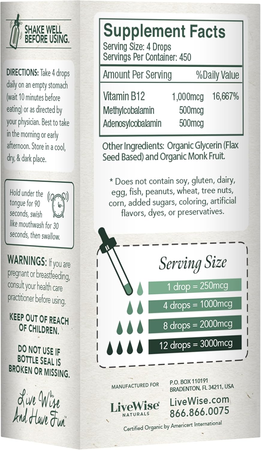 Livewise Naturals B12 Vitamin Drops Non-Gmo, Organic Bioactive Blend For Energy, Clarity, Focus, And Easy Absorption, Adenosylcobalamin & Methylcobalamin Supplement, Vegan, Gluten-Free, Dairy-Free