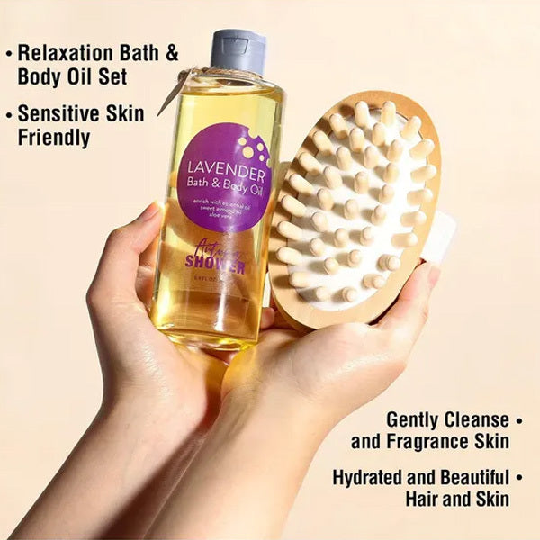 Product Information:Crafted with a harmonious blend of Aloe Vera, Shea Butter, Sweet Almond, Coconut, and Sunflower oil, our Lavender Bath and Body Oil Set hydrates and nourishes your skin, offering respite from dryness,Features:This Lavender Oil moisturizes and treats dry skin, leaving it refreshed and revitalized. Immerse yourself in a carefree mood with the mild and relaxing lavender scent, enhancing your bath and body experience. Body Massager releases your hands to prevent greasy hands after applying body oil,Product Specification:Enriched with Aloe Vera, Shea Butter, and natural oils