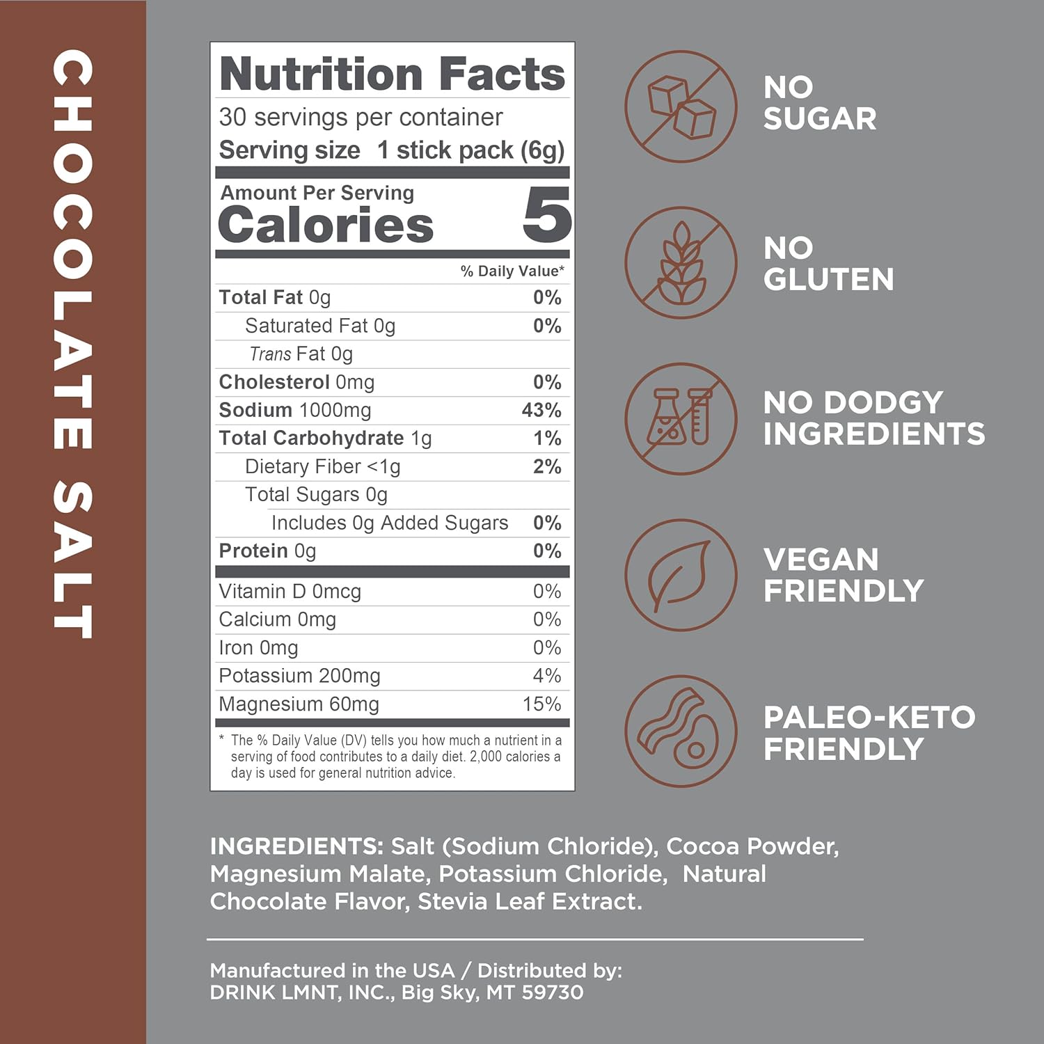 About this item THE BEST ZERO SUGAR HOT CHOCOLATE: Rich and subtly salty, LMNT’s chocolate flavors are the best way to enjoy hot chocolate. Or you can sprinkle half a stick in your morning coffee for a mean mocha. INGREDIENTS THAT WORK WITH YOUR LIFESTYLE: No BS – no sugar, no gluten and no dodgy ingredients. LMNT is formulated with the optimal ratio of sodium, potassium, and magnesium to keep you hydrated. STAY COZY WHILE STAYING HEALTHY: Warm up your winter with LMNT's zero sugar hot chocolate or enjoy next to the fire on a summer evening. TAKE OUR SALT AND MAKE IT YOURS: Not only can you use LMNT's chocolate flavors for zero sugar mochas and zero sugar hot chocolate. You can also mix them into your protein shakes, overnight oats, and your favorite recipes. HOW TO #STAYSALTY: Mix 1/2–1 stick pack with 14-16 ounces of hot water, coffee, or milk. › See more product details,THE BEST ZERO SUGAR HOT CHOCOLATE: Rich and subtly salty, LMNT’s chocolate flavors are the best way to enjoy hot chocolate. Or you can sprinkle half a stick in your morning coffee for a mean mocha,INGREDIENTS THAT WORK WITH YOUR LIFESTYLE: No BS – no sugar, no gluten and no dodgy ingredients. LMNT is formulated with the optimal ratio of sodium, potassium, and magnesium to keep you hydrated,STAY COZY WHILE STAYING HEALTHY: Warm up your winter with LMNT's zero sugar hot chocolate or enjoy next to the fire on a summer evening,TAKE OUR SALT AND MAKE IT YOURS: Not only can you use LMNT's chocolate flavors for zero sugar mochas and zero sugar hot chocolate. You can also mix them into your protein shakes, overnight oats, and your favorite recipes,HOW TO #STAYSALTY: Mix 1/2–1 stick pack with 14-16 ounces of hot water, coffee, or milk