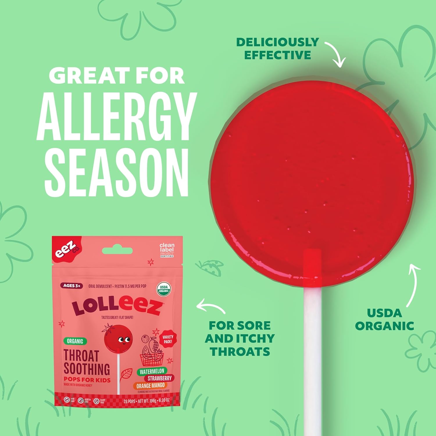 About this item Great Tasting, Effective Relief: A throat lozenge in a kid-friendly, flat lollipop/sucker form that kids love! These organic throat soothing pops/suckers help relieve sore & irritated throats. The Perfect Solution for Allergy Season: An âEEZyâ way (pun intended) to feel better & soothe kidsâ sore throats during the spring/summer allergy season Made with Clean and Organic Ingredients: These sore throat pops are USDA certified organic, NON-GMO, gluten free & dairy free, and made with no artificial dyes or sweeteners. Clean Label Project Certified: We took an extra step and are proud to be Clean Label Project Certified, which means itâs verified by a 3rd party certifying body that you can actually trust. All Lolleez products are made with clean ingredients. Kid friendly & fun flavors: These delicious pops/suckers come in a Strawberry flavor that are great tasting and a clear kidsâ favorite! Always free of artificial dyes, & ingredients Lolleez is proud to always be free of artificial dyes & ingredients. (Be sure to always look for either the USDA certified organic logo or the âClean Label Project Verifiedâ to help confirm & validate this) Founded by parents: Founded by parents who were looking for a better alternative, we created Lolleez with our own kids in mind, which is why we try our best to always source the best possible ingredients. âș See more product details,Great Tasting, Effective Relief: A throat lozenge in a kid-friendly, flat lollipop/sucker form that kids love! These organic throat soothing pops/suckers help relieve sore & irritated throats,The Perfect Solution for Allergy Season: An âEEZyâ way (pun intended) to feel better & soothe kidsâ sore throats during the spring/summer allergy season,Made with Clean and Organic Ingredients: These sore throat pops are USDA certified organic, NON-GMO, gluten free & dairy free, and made with no artificial dyes or sweeteners,Clean Label Project Certified: We took an extra step and are proud to be Clean Label Project Certified, which means itâs verified by a 3rd party certifying body that you can actually trust. All Lolleez products are made with clean ingredients,Kid friendly & fun flavors: These delicious pops/suckers come in a Strawberry flavor that are great tasting and a clear kidsâ favorite!,Always free of artificial dyes, & ingredients Lolleez is proud to always be free of artificial dyes & ingredients. (Be sure to always look for either the USDA certified organic logo or the âClean Label Project Verifiedâ to help confirm & validate this),Founded by parents: Founded by parents who were looking for a better alternative, we created Lolleez with our own kids in mind, which is why we try our best to always source the best possible ingredients