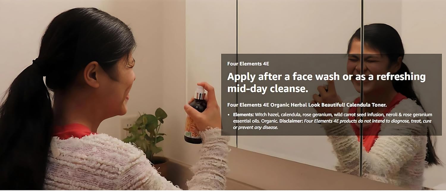 About this item Our Look Beautiful! Calendula Toner won 1st Place at the 16th International Herb Symposium 2023 for Luscious Lotions & Creams category. Visit the International Herb Symposium website and click on the Product Contest Winners Look Beautiful! Calendula Toner: is designed to soothe and refresh the skin, leaving it feeling clean and rejuvenated. Organic Ingredients: We use only the highest quality, organic ingredients in our toner, including Witch Hazel, Calendula, Rose Geranium, and Wild Carrot Seed, to provide a natural, nourishing experience for your skin. Elements: Witch hazel, calendula*, rose geranium*, wild carrot seed* infusion, neroli and rose geranium essential oils. *Organic Four Elements Organic Herbals is an all-women owned and operated certified organic farm where all our herbs are meticulous hand-harvested and thoughtfully curated. Grown, crafted and packaged in Wisconsin, USA since 1987. Disclaimer: Four Elements 4E products do not intend to diagnose, treat, cure or prevent any disease. See more product details,Our Look Beautiful! Calendula Toner won 1st Place at the 16th International Herb Symposium 2023 for Luscious Lotions & Creams category. Visit the International Herb Symposium website and click on the Product Contest Winners,Look Beautiful! Calendula Toner: is designed to soothe and refresh the skin, leaving it feeling clean and rejuvenated,Organic Ingredients: We use only the highest quality, organic ingredients in our toner, including Witch Hazel, Calendula, Rose Geranium, and Wild Carrot Seed, to provide a natural, nourishing experience for your skin,Elements: Witch hazel, calendula*, rose geranium*, wild carrot seed* infusion, neroli and rose geranium essential oils. *Organic,Four Elements Organic Herbals is an all-women owned and operated certified organic farm where all our herbs are meticulous hand-harvested and thoughtfully curated. Grown, crafted and packaged in Wisconsin, USA since 1987,Disclaimer: Four Elements 4E products do not intend to diagnose, treat, cure or prevent any disease