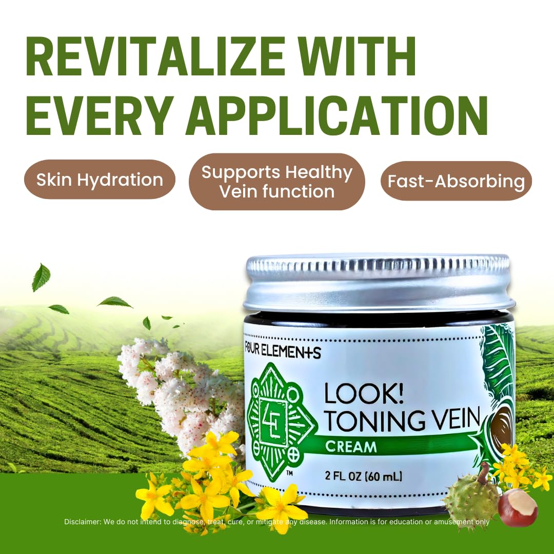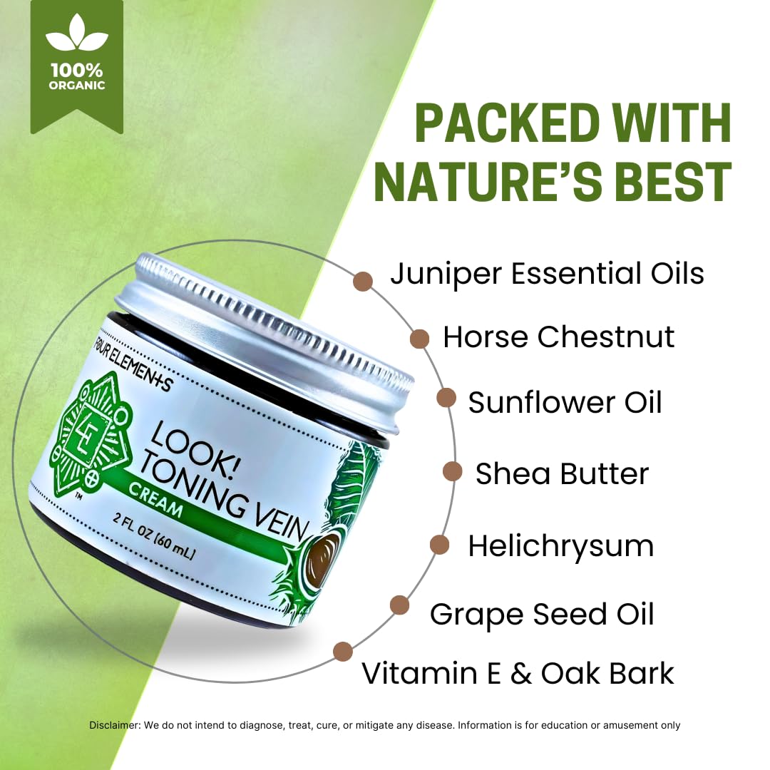 Experience the transformative power of nature with our organic Look! Toning Vein Cream. Classic herbs that support healthy vein function are blended to assist and support healthy circulation. Based on classic Horse Chestnut fruits and oak bark, use in the morning and at night for faster results. Elements: Sunflower oil*, horse chestnut*, gotu kola*, St. John’s wort* and white oak bark* infusion, beeswax, borax, shea butter*, vitamin E, helichrysum essential oil, juniper essential oil, grapefruit essential oil, potassium sorbate. *Organic. Disclaimer: Four Elements 4E products do not intend to diagnose, treat, cure or prevent any disease,Support healthy circulation: Our all-natural formula features organic sunflower oil, horse chestnut, and gotu kola to help improve blood flow and reduce the appearance of varicose veins,Soothe and nourish skin: St. John's wort and white oak bark infusion, shea butter, and vitamin E work together to calm and hydrate dry, irritated skin, leaving it feeling soft and supple,All-natural ingredients: We use only the highest-quality, organic ingredients in our cream, including beeswax, and a blend of essential oils (helichrysum, juniper, and grapefruit) to deliver maximum benefits without harsh chemicals. Safe and effective: Our Very Close Vein Cream is free of parabens, sulfates, and artificial fragrances, making it safe for all skin types,Elements: Sunflower oil*, horse chestnut*, gotu kola*, St. John’s wort* and white oak bark* infusion, beeswax, borax, shea butter*, vitamin E, helichrysum essential oil, juniper essential oil, grapefruit essential oil, potassium sorbate. *Organic,Four Elements Organic Herbals is an all-women owned and operated certified organic farm where all our herbs are meticulous hand-harvested and thoughtfully curated. Grown, crafted and packaged in Wisconsin, USA since 1987,Disclaimer: Four Elements 4E products do not intend to diagnose, treat, cure or prevent any disease