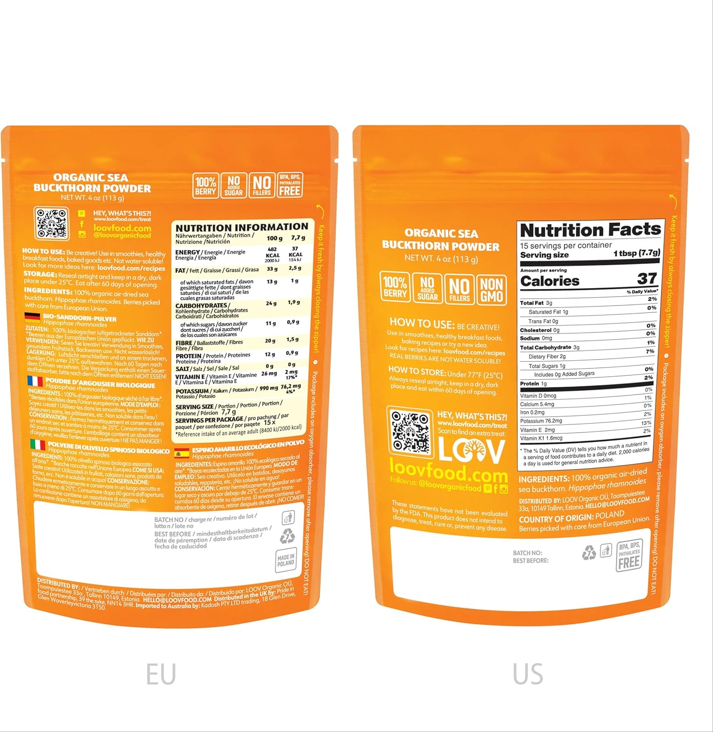 Loov Organic Sea Buckthorn Powder, High In Fibre, Made From 100% Whole Berries, 113 G, Grown In Nordic Climate, Rich In Omega Blend, Vitamin C, Vitamin E, 23-Day Supply, No Added Sugar, Non-Gmo