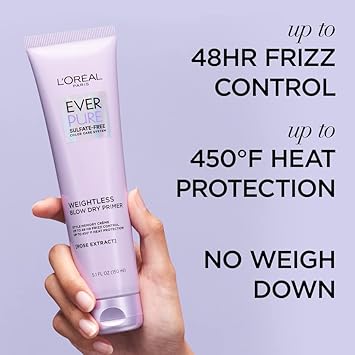 L'Oreal Paris EverPure Weightless Blow Dry Primer with rose extract helps perfect blow dry results by providing enhanced style memory and up to 48-hour frizz control. Formulated with 450F heat protection, our primer helps keep hair looking nourished, smooth and beautifully shiny - without weighing down. OUR PUREST RESPECT FOR YOUR HAIR - 100% sulfate-free, paraben-free, dye-free, gluten-free and vegan. Validated by hair colorists.* Because You're Worth It *Validated by an internal expert team of professional hair colorists with extensive in person testing,STYLE WITH HEAT PROTECTION - EverPure Weightless Blow Dry Primer is formulated with 450F heat protection to help prevent damage from heat styling,PERFECT BLOW DRY RESULTS - Provides enhanced style memory and up to 48 hour frizz control. Indulgent, creamy formula helps keep hair looking nourished, smooth and beautifully shiny, without weigh down,PREMIUM SULFATE FREE FORMULA - 100 percent sulfate-free, paraben-free, dye-free, gluten-free and vegan. With rose extract. Anti fade and UV filter. Gentle on color. Validated by hair colorists,SOPHISTICATED SCENT - EverPure Weightless Blow Dry Primer has a luxurious fresh, floral fragrance featuring notes of fresh almond blossom and creamy musk,HOW TO GET THE PERFECT BLOW OUT - Shampoo and condition with EverPure Bond Strengthening. Then, apply EverPure Weightless Blow Dry Primer to towel-dried hair, blow dry for desired look. Restyle with heat tools as needed