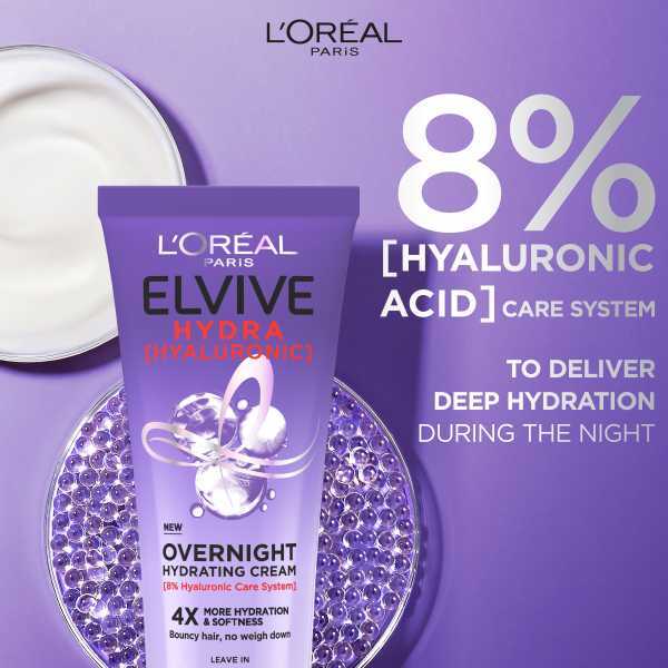 Inspired by skincare, Elvive Overnight Hydrating Cream offers an 8% Hyaluronic Acid Care System to instantly boost hair with deep hydration and 4x more softness¹ overnight