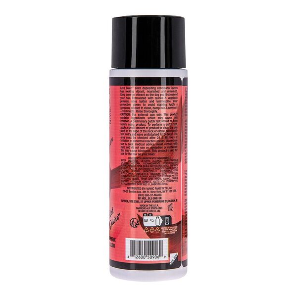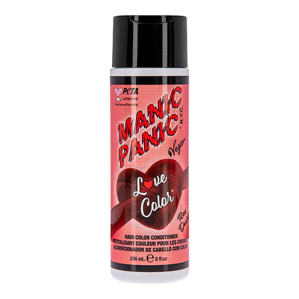 Product Information:Never lose the passion for your vibrancy! Manic Panic Red Desire Colour Depositing Conditioner doesn’t hold back on pigment and can be used on a number of red tones!,Features:100% vegan and cruelty-free. Leaves hair feeling nourished and smooth and colour vibrant,Warning or Restrictions:For external use only. Keep out of reach of children. Product contains ingredients that may cause skin irritation; perform a preliminary patch test 24-48 hours before application to check for allergies or unexpected reactions. Do not use this product to dye eyebrows or eyelashes. If product gets into eyes, immediatly rinse well with water and consult a medical professional,Product Specification:Aqua (Water), Cetearyl Alcohol, Behentrimonium Chloride, Glycerin, Cocamidopropyl Hydrocysultaine, Butyrospermum Parkii (shea) Butter, Panthenol, Isopropyl Alcohol, Silicone Quaternium-16, Phenoxyethanol, Sodium Chloride, Glucose, Undeceth-11, Ethylhexylglycerin, Butyloctanol, Undeceth-5, Disodium EDTA, Hydrolyzed Verbascum Thapsus Flower, Hydrolyzed Vegetable Protein, Hydrolyzed Quinoa, Citric Acid, Benzyl Alcohol, Sodium Benzoate, Potassium Sorbate, Acetic Acid, Iodopropynyl Butylcarbamate, Basic Red 51, Basic Yellow 40,Product Uses:Wear protective gloves to avoid staining hands. Apply a generous amount to clean, damp hair. Leave on for 5-15 minutes before rinsing thoroughly with cool water