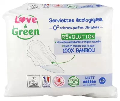 Love &Amp; Green Hypoallergenic Night Napkins 10 Napkins Are Hygienic Protections With Fins, More Natural And Respectful: Extra-Fine And Ultra-Absorbent. They Are Equipped With: A Veil In Contact With The Skin 100% Of Natural Origin Without Chemical Lotion Or Coloring, An Ultra Soft Cushion Composed Of Cellulose Not Bleached With Chlorine And Ultra-Absorbent Micro-Beads For Optimal Efficiency, An Outer Shell Made From Vegetable Matter. Tested Under Dermatological And Gynecological Control. Hypoallergenic. Dye-Free, Fragrance-Free, Lotion-Free And Allergen-Free. 82% Of The Towel Is Of Natural Origin (Excluding Packaging). Certified By Ecolabel, European Ecological Label. Control It/047/002. Vegan