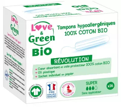 Love & Green Hypoallergenic Tampons 100% Organic Cotton 16 Super Tampons Without Applicator Is A Hypoallergenic Tampon With An Absorbent Core And A Protective Veil 100% In Organic Cotton, Bleached Without Chlorine Or Chlorine Derivatives. The Cord Is Also Made Of 100% Organic Cotton. Hypoallergenic, Dermatologically Tested. Fragrance-Free, Dye-Free, Chlorine-Free And Plastic-Free. Product Certified Gots By Ecocert. 100% Organic Cotton From Organic Farming. Cruelty Free. Vegan