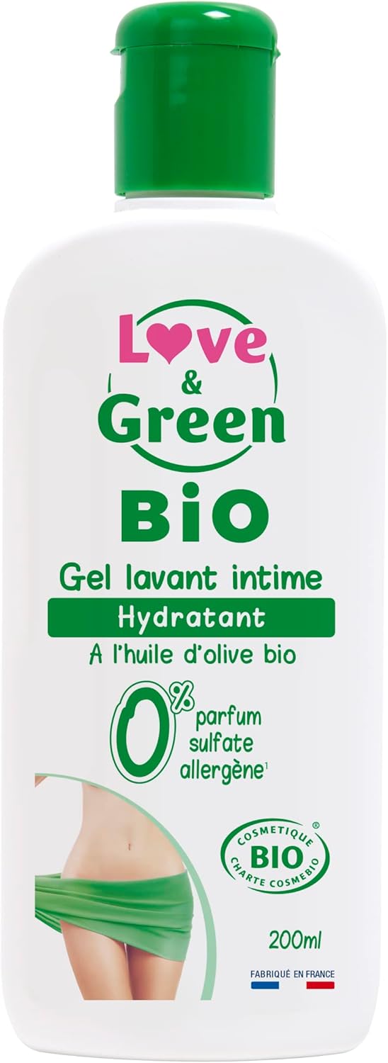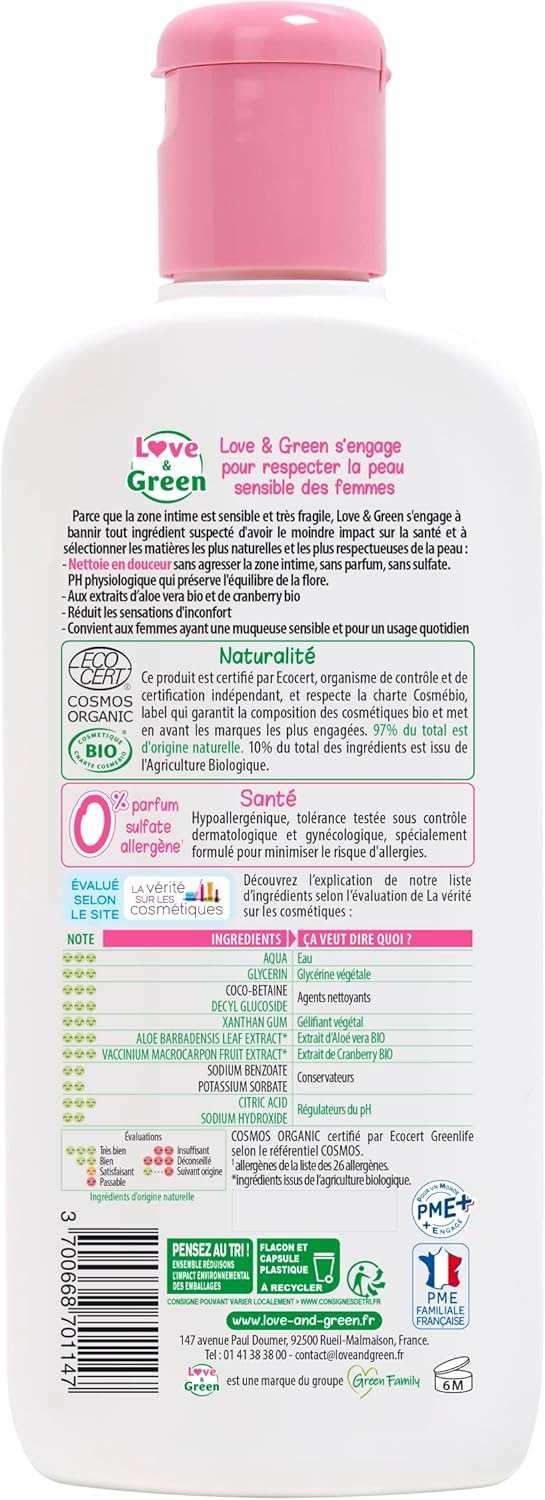Product Description Love & Green's organic soothing intimate gel reduces feelings of discomfort. Suitable for women with a sensitive mucosa. 200ml Made in France. Ingredients Aqua, Glycerin, Coco-Betaine, Decyl Glucoside, Xanthane, Aloe Barbadensis Leaf Extract**, Vaccinum Macrocarpon Fruit Extract**, Sodium Benzoate, Citric Acid, Sodium Hydroxide, Potassium Sorbate. ** Ingredient from organic farming,Soothe intimate discomfort - This gentle washing gel reduces the sensations of discomfort thanks to its formula enriched with aloe vera and cranberry. It respects the balance of the intimate flora with a physiological pH,FREE FROM AGGRESSIVE CHEMICALS - 0% perfume, sulfates, parabens, dyes and other chemicals. Hypoallergenic and dermatologically and gynecologically tested,Certified organic formula - Certified by Ecocert Greenlife, this washing gel is made from 97% ingredients of natural origin, guaranteeing a safe and respectful use of your body,IDEAL FOR SENSITIVE SKIN - Designed for women with sensitive mucosa, this gel is perfect for everyday use, bringing softness and soothing with every use,MADE IN FRANCE - Enjoy French quality with this intimate washing gel, manufactured locally to guarantee the highest standards of safety and effectiveness