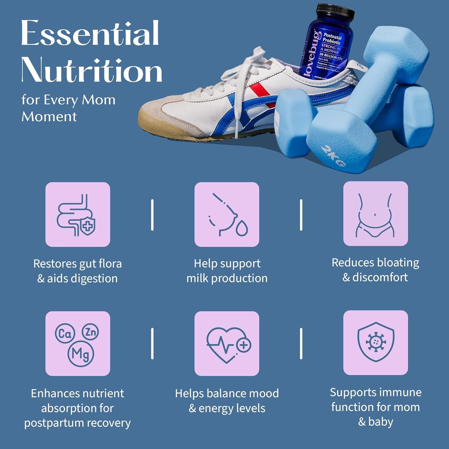 About this item FOR BREAST MILK PRODUCTION & ACID REFLUX RELIEF. Includes our proprietary lactation blend of Fenugreek Seed, Milk Thistle & Fennel Seed. Helps boost your natural production of B vitamins, including folate.* SUPPORTS POSTNATAL DIGESTIVE & IMMUNE HEALTH: Multi-strain formula including B Infantis & L Plantarum. Support your digestive and immune health, support glucose levels already in a normal range, and support mental & emotional function.* ALLERGEN FRIENDLY, VEGAN PROBIOTICS. We take everyone into account which is why our probiotics are free of the 8 major allergens. NON-GMO WITH NO ARTIFICIAL COLORS OR FLAVORS. Choose a probiotic with natural ingredients. Our probiotics are free of GMO's, fillers, artificial colors, flavors or ingredients. AWARD WINNING. Lovebug is the proud recipient of the Eco-Excellence Award, and various widely recognized "Product of the Year" accolades. These awards recognize LoveBug's commitment to not only quality and purity, but also crafting products that meet the unique needs of our customers. LOVEBUG – THE NAME YOU TRUST IN PROBIOTICS. Created by a mom, for moms & trusted by moms everywhere, our staged-line of probiotics has you covered for the whole family. All of our products are third-party tested and manufactured in the USA, in a GMP registered facility to the highest quality standards. › See more product details,FOR BREAST MILK PRODUCTION & ACID REFLUX RELIEF. Includes our proprietary lactation blend of Fenugreek Seed, Milk Thistle & Fennel Seed. Helps boost your natural production of B vitamins, including folate,SUPPORTS POSTNATAL DIGESTIVE & IMMUNE HEALTH: Multi-strain formula including B Infantis & L Plantarum. Support your digestive and immune health, support glucose levels already in a normal range, and support mental & emotional function,ALLERGEN FRIENDLY, VEGAN PROBIOTICS. We take everyone into account which is why our probiotics are free of the 8 major allergens. NON-GMO WITH NO ARTIFICIAL COLORS OR FLAVORS. Choose a probiotic with natural ingredients. Our probiotics are free of GMO's, fillers, artificial colors, flavors or ingredients,AWARD WINNING. Lovebug is the proud recipient of the Eco-Excellence Award, and various widely recognized "Product of the Year" accolades. These awards recognize LoveBug's commitment to not only quality and purity, but also crafting products that meet the unique needs of our customers,LOVEBUG – THE NAME YOU TRUST IN PROBIOTICS. Created by a mom, for moms & trusted by moms everywhere, our staged-line of probiotics has you covered for the whole family. All of our products are third-party tested and manufactured in the USA, in a GMP registered facility to the highest quality standards