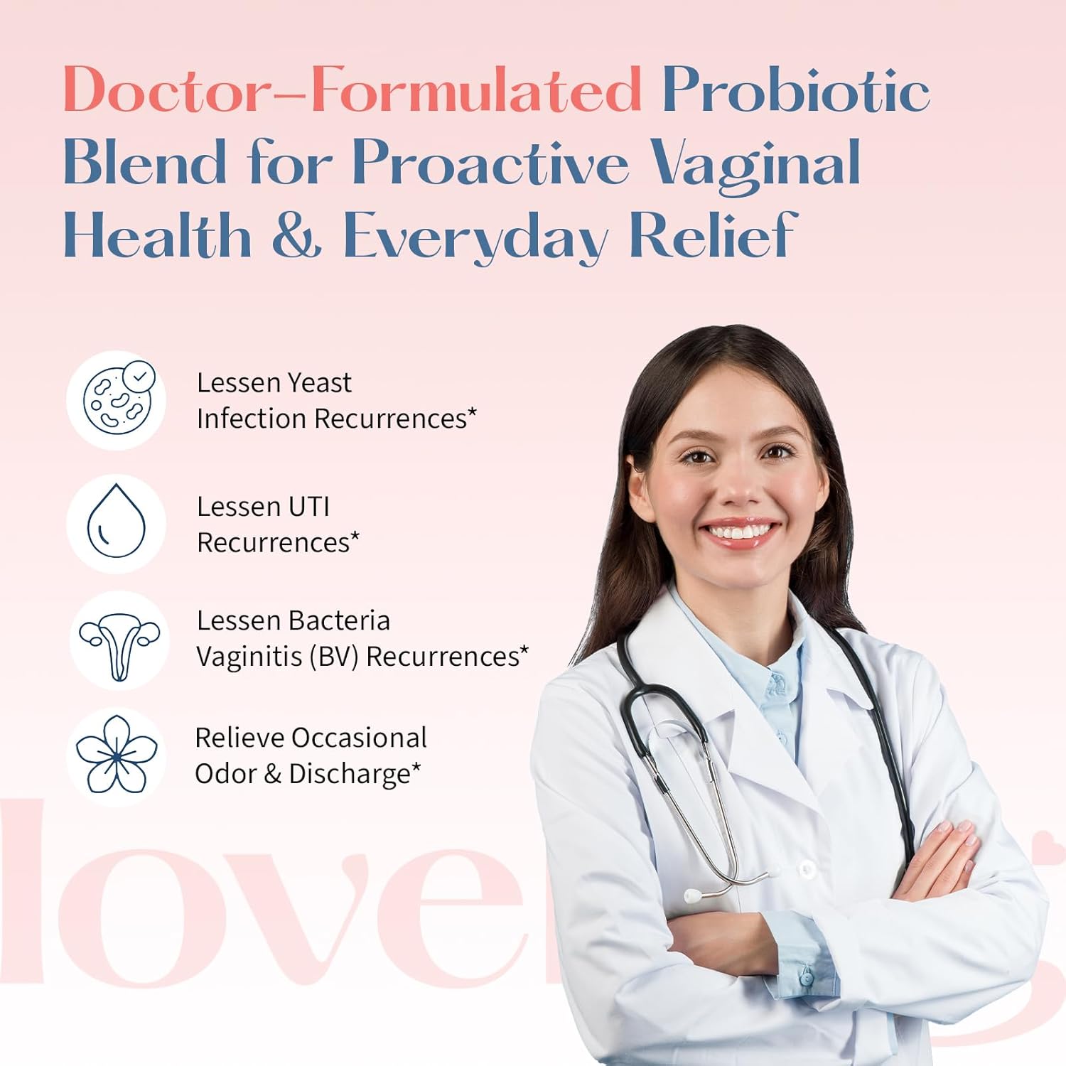 About this item Own Your Intimate Wellness - With Lovebug probiotics for women, you’re in control. Designed to help balance vaginal flora, yeastand pH levels*, promoting optimal vaginal health, enhancing lubrication, and keeping UTI, BV and occasional odor at bay* Pro-Active Probiotics - Maintaining a healthy vaginal microbiome is vital for feminine health*, as it can help to prevent common issues like vaginal itching, dryness, discomfort, unpleasant vaginal odor and excessive discharge* before they even start Developed With Doctors - V-Best works by replenishing lactobacilli probiotic levels with 90 billion CFUs and 15 strains including Lactobacillus acidophilus, rhamnosus GG, reuteri, gasseri and organic inulin prebiotics for enhanced effectiveness Essential Vaginal Vitamins - Love Bug capsules feature Vitamin D & E for smooth lubrication, targeted womens probiotic for pH balance, prebiotics to supercharge probiotics, and the added benefits of garlic & cranberry powder for urinary tract health* Easy To Take - Consistency is key with female vaginal probiotics, which is why Lovebug women's health supplements fit easily into your routine. 2 female probiotic capsules daily is all you need & no refrigeration is necessary for added convenience › See more product details,Own Your Intimate Wellness - With Lovebug probiotics for women, you’re in control. Designed to help balance vaginal flora, yeastand pH levels*, promoting optimal vaginal health, enhancing lubrication, and keeping UTI, BV and occasional odor at bay,Pro-Active Probiotics - Maintaining a healthy vaginal microbiome is vital for feminine health*, as it can help to prevent common issues like vaginal itching, dryness, discomfort, unpleasant vaginal odor and excessive discharge* before they even start,Developed With Doctors - V-Best works by replenishing lactobacilli probiotic levels with 90 billion CFUs and 15 strains including Lactobacillus acidophilus, rhamnosus GG, reuteri, gasseri and organic inulin prebiotics for enhanced effectiveness,Essential Vaginal Vitamins - Love Bug capsules feature Vitamin D & E for smooth lubrication, targeted womens probiotic for pH balance, prebiotics to supercharge probiotics, and the added benefits of garlic & cranberry powder for urinary tract health,Easy To Take - Consistency is key with female vaginal probiotics, which is why Lovebug women's health supplements fit easily into your routine. 2 female probiotic capsules daily is all you need & no refrigeration is necessary for added convenience