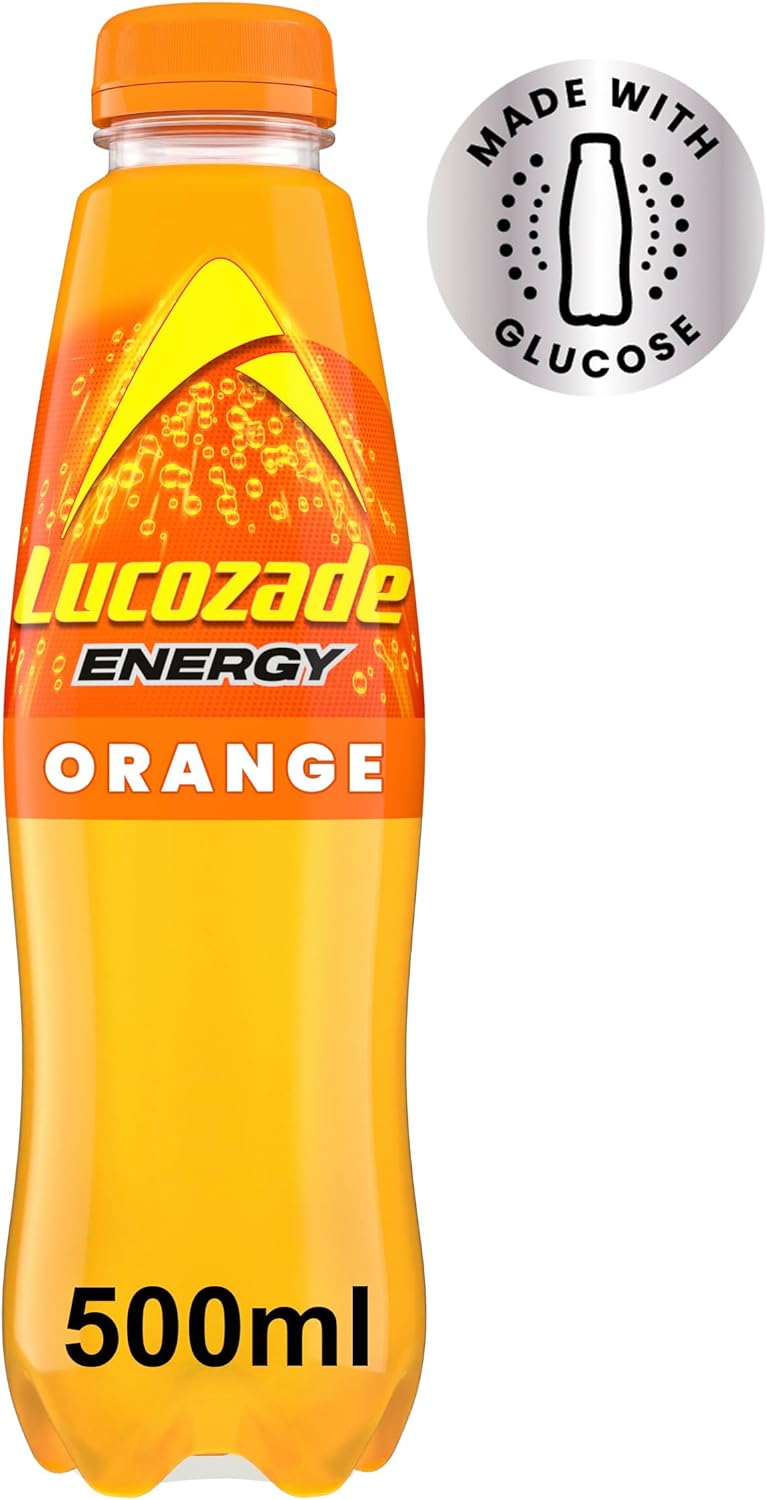 Product Description Originally launched as ‘Glucozade’ in 1927 by chemist, William Hunter, Lucozade was the first to combine great taste with glucose and was used extensively throughout hospital wards and pharmacies in the years that followed. Fast forward 90 + years, Lucozade Energy is now the UK’s biggest energy brand and has evolved into a fun and vibrant drink enjoyed by millions of consumers. We also launched Lucozade 'Zero' so that customers can enjoy the great taste of Lucozade without the sugar. We are always bringing out new and exciting flavours to fit the ever changing consumer trends, but ultimately we still have the great taste at the core of Lucozade Energy. Ingredients Carbonated Water, Glucose Syrup (11%), Orange Juice from Concentrate (6%), Acid (Citric Acid), Acidity Regulator (Sodium Gluconate), Flavourings, Preservative (Potassium Sorbate), Sweeteners (Sucralose, Acesulfame K), Stabiliser (Acacia Gum), Caffeine, Antioxidant (Ascorbic Acid), Niacin (Vitamin B3), Colour (Beta Carotene) P.when('A').execute(function(A) { A.on('a:expander:toggle_description:toggle:collapse', function(data) { window.scroll(0, data.expander.$expander[0].offsetTop-100); }); }); Directions Once opened refrigerate. Drink within 4 days Manufacturer Contact Information ?Lucozade Ribena Suntory Limited, 2 Longwalk Road, Stockley Park, Uxbridge, UB11 1BA. See more,Our refreshing Lucozade Energy is bursting with sparkling flavour. With Glucose and Vitamin B3 to help reduce tiredness, Lucozade Energy helps you get through your day!,Lucozade is all about unlocking the potential of people's positivity energy! With Vitamin B3 to help reduce tiredness, Lucozade Energy supports your everyday energy to get you through even your busiest days! As well as tasting great, we also try to do great things to ensure we're doing our bit for a sustainable future! From January 2022, all of our bottles are fitted with our new 60% transparent sleeve. This gives all our recyclable products the best chance of being turned back into bottles and used again!,Bursting with orange citrus flavour, Lucozade Energy Orange is refreshing and zesty! Best enjoyed cold,Once opened store in the fridge and drink within 4 days