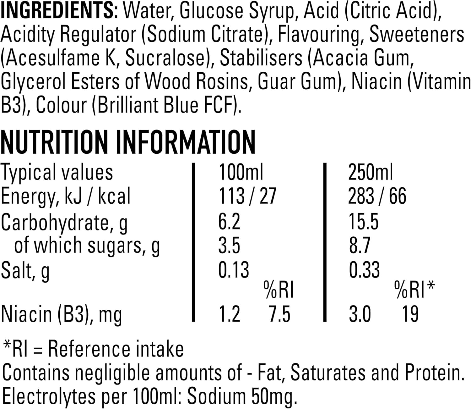 Product Description Lucozade Sport is an isotonic sports drink which provides carbohydrates and electrolytes to enhance hydration and help maintain performance during prolonged endurance exercise. The perfect performance partner. Ingredients Water, Glucose Syrup, Acid (Citric Acid), Acidity Regulator (Sodium Citrate), Flavouring, Sweeteners (Acesulfame K, Sucralose), Stabilisers (Acacia Gum, Glycerol Ester of Wood Rosins, Guar Gum), Niacin (Vitamin B3), Colour (Brilliant Blue FCF) P.when('A').execute(function(A) { A.on('a:expander:toggle_description:toggle:collapse', function(data) { window.scroll(0, data.expander.$expander[0].offsetTop-100); }); }); Directions Once opened refrigerate. Drink within 4 days Safety Warning Contains wheat derivative. Once opened, consume within 4 days. Check ingredients for potential allergens. Manufacturer Contact Information Lucozade Ribena Suntory Limited, 2 Longwalk Road, Stockley Park, Uxbridge, UB11 1BA. See more,Orange Flavour Isotonic Drink with Sugars and Sweeteners.? Lucozade Sport is an isotonic sports drink which provides carbohydrates and electrolytes to enhance hydration and help maintain performance during prolonged endurance exercise,Fuels Performance - Lucozade Sport provides ~16g of carbohydrate per 250ml serving and electrolytes to help maintain performance during prolonged endurance exercise,Enhanced Hydration - We lose fluid and electrolytes when we sweat which are important to replace. Lucozade Sport contains sodium, the main electrolyte lost in sweat, and carbohydrates to enhance hydration during physical exercise,Your performance partner in sports and exercise. Lucozade Sport is designed with a sports cap and ribbed bottle for easy use on the go,Bursting with Flavour - Not only does Lucozade Sport provide functional benefits, but we have also ensured all our drinks include mouth watering flavours