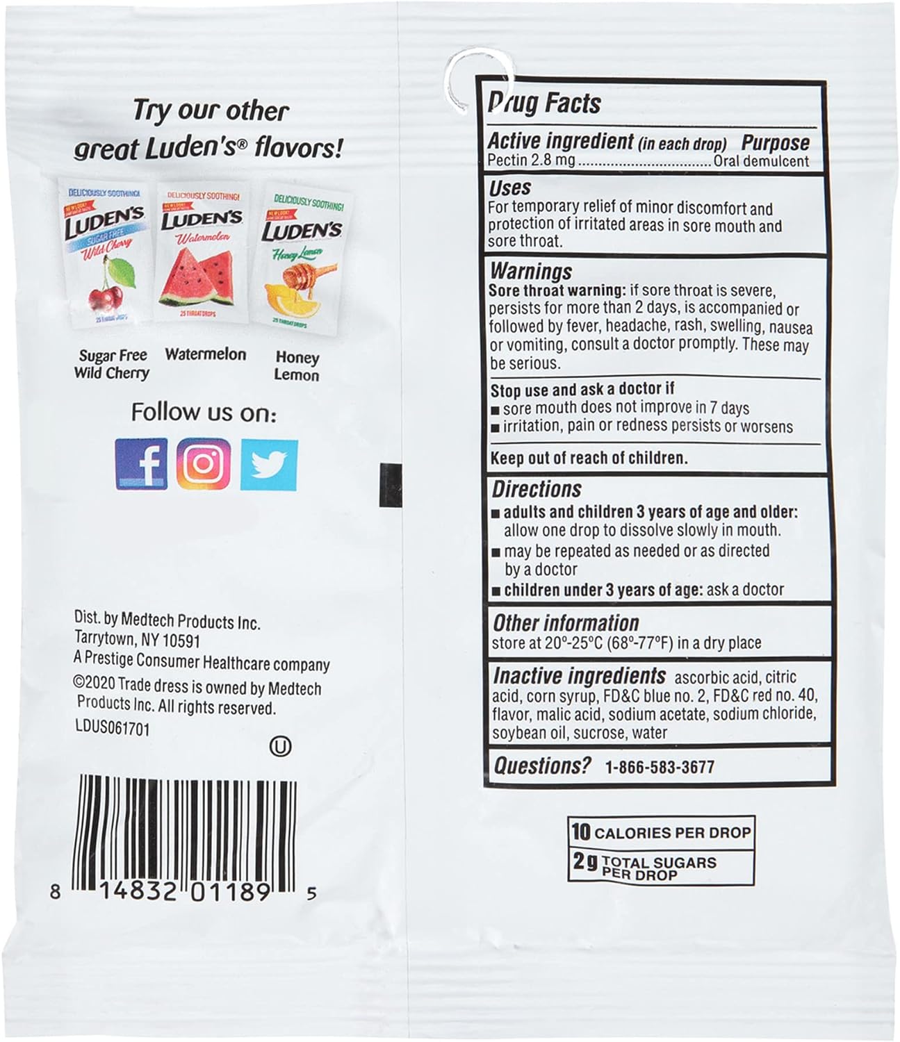 Luden's Wild Cherry Throat Drops soothe and relieve minor, everyday throat irritationDeliciously soothing and great tasting, temporary sore throat relief without mentholFast-acting drops relieve a scratchy, irritated and sore throatLuden's Throat Drops are available in an assortment of flavors and are great for the whole family, including kids 3 and upActive ingredient: Pectin 2.8 mg, oral demulcent to soothe and protect sore throat and sore mouthFor over 100 years, Luden's has been soothing irritated throats with our great tasting drops. Luden's deliciously soothing throat drops help relieve minor discomfort and protect irritated areas in sore mouth and sore throat so you can get on with your day. Luden's Throat Drops come in a variety of delicious flavors and are great for the whole family at home or on-the-go. This product comes with 1 box of 20 individually-wrapped Wild Cherry Flavor Throat Drops. Allow one drop to dissolve slowly in mouth and may be repeated as needed or as directed by a doctor. For use by adults and children 3 years of age and older