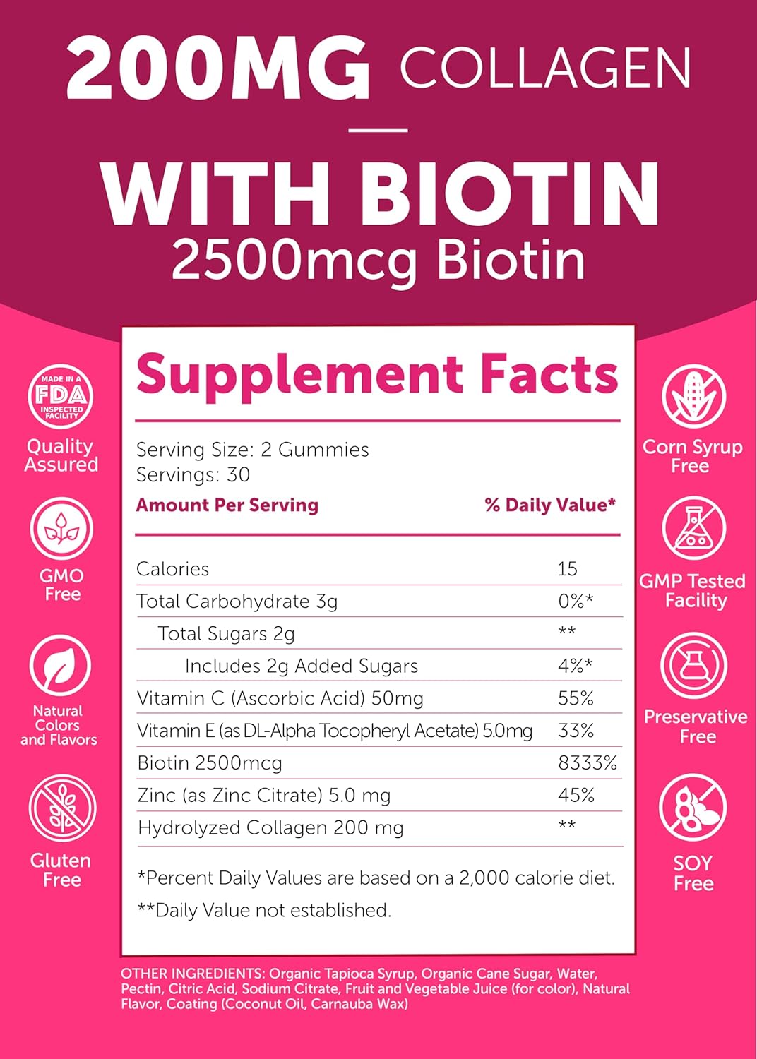 Premium Quality Ingredients: Each gummy is packed with 200mg of hydrolyzed collagen, biotin, zinc, and vitamins C & E, carefully selected to support your overall health